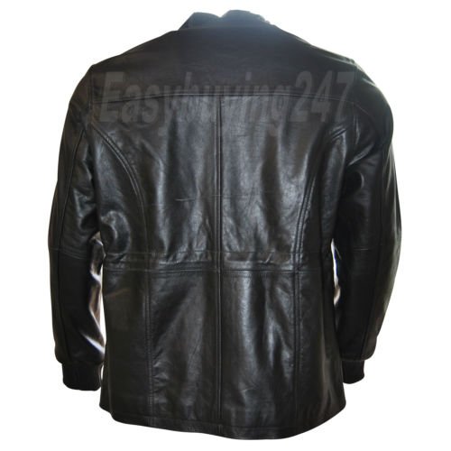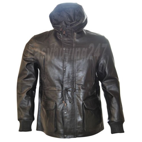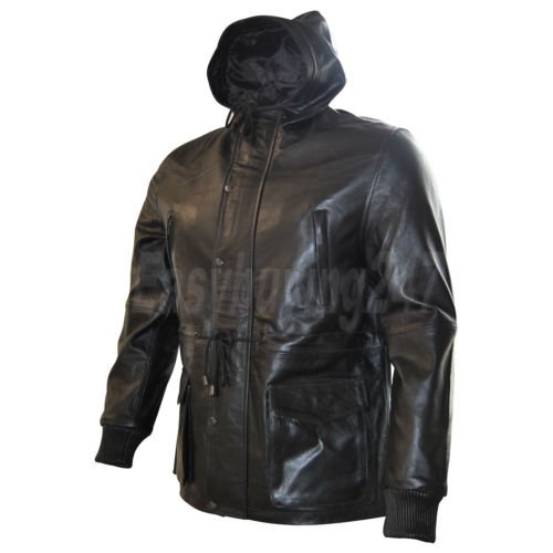 Black Hooded Coat Leather Jacket with Ribbed Cuff & Front Button Closure for Men