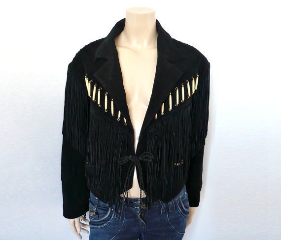 . Western Style Black Suede Leather Jacket With Fringes & Bone Beads