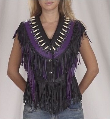 Purple Black Contrast Fringes Bone Beads Suede Leather Vest Jacket for Women's