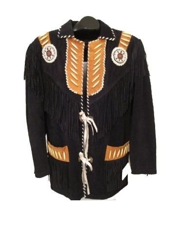 Black Western Style Cowboy Leather Jacket Coat with Fringes & Bone Beads for Men