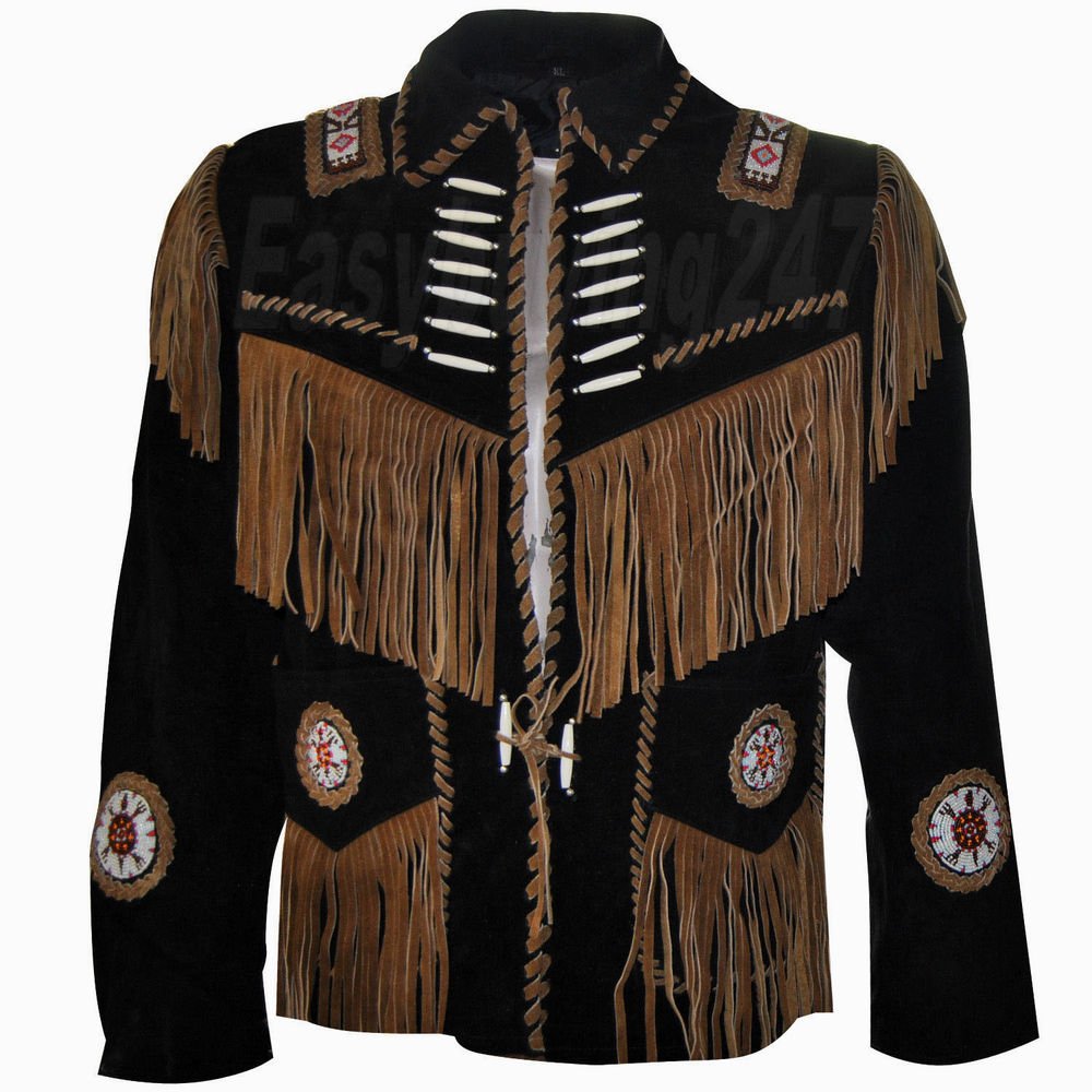 Men's Black Western Style Bone Beaded Long Fringed Leather Jacket