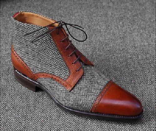 Men High Ankle Burnished Gray Suede Brown Cap Toe Laceup Tweed Pure Leather Boot