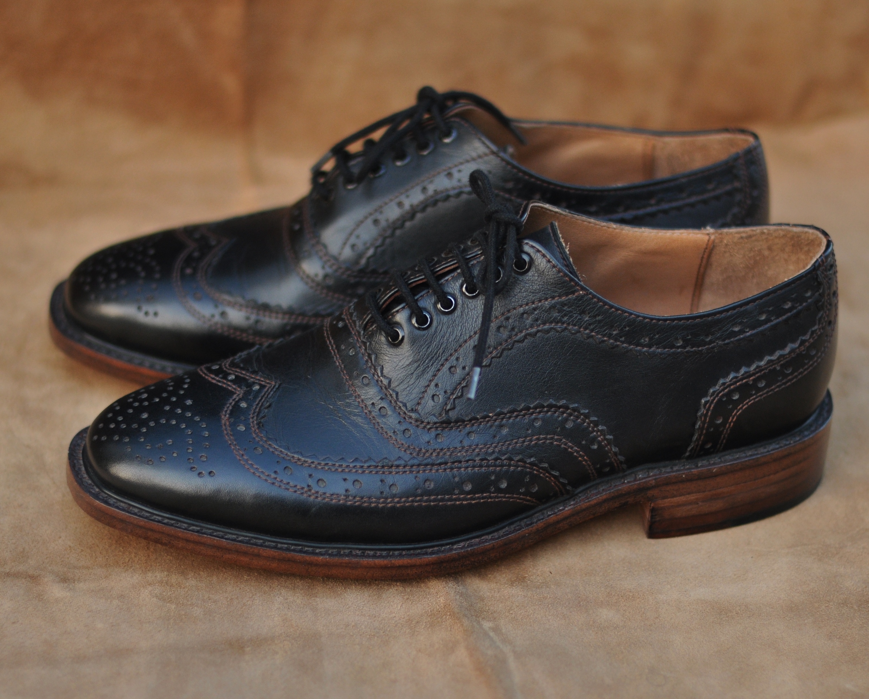 Black Wing Tip Full Brogues Laceup Oxford Real Leather Shoes With Brown Sole