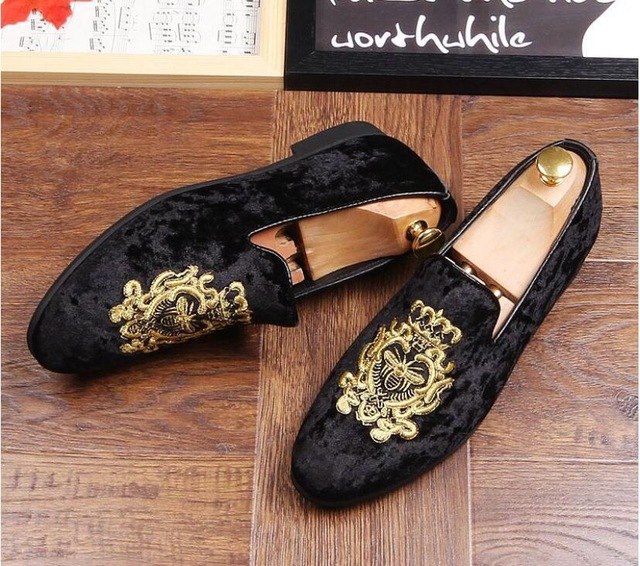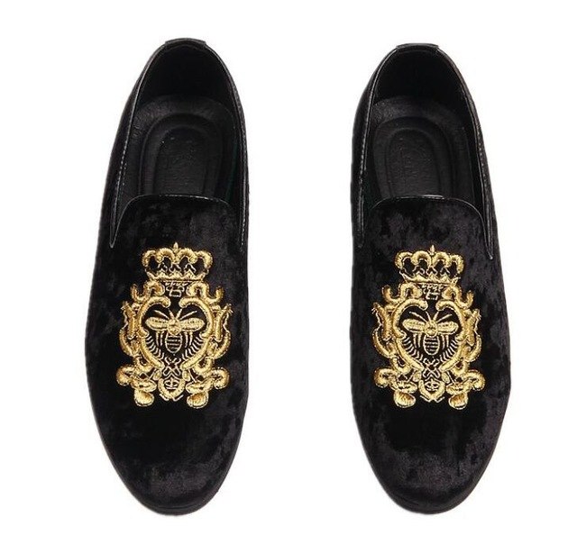 Loafer Slip On Black Velvet Gold Embroidery Wedding Fashion Party Wear Handmade Shoes