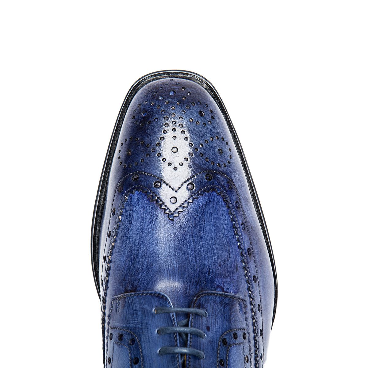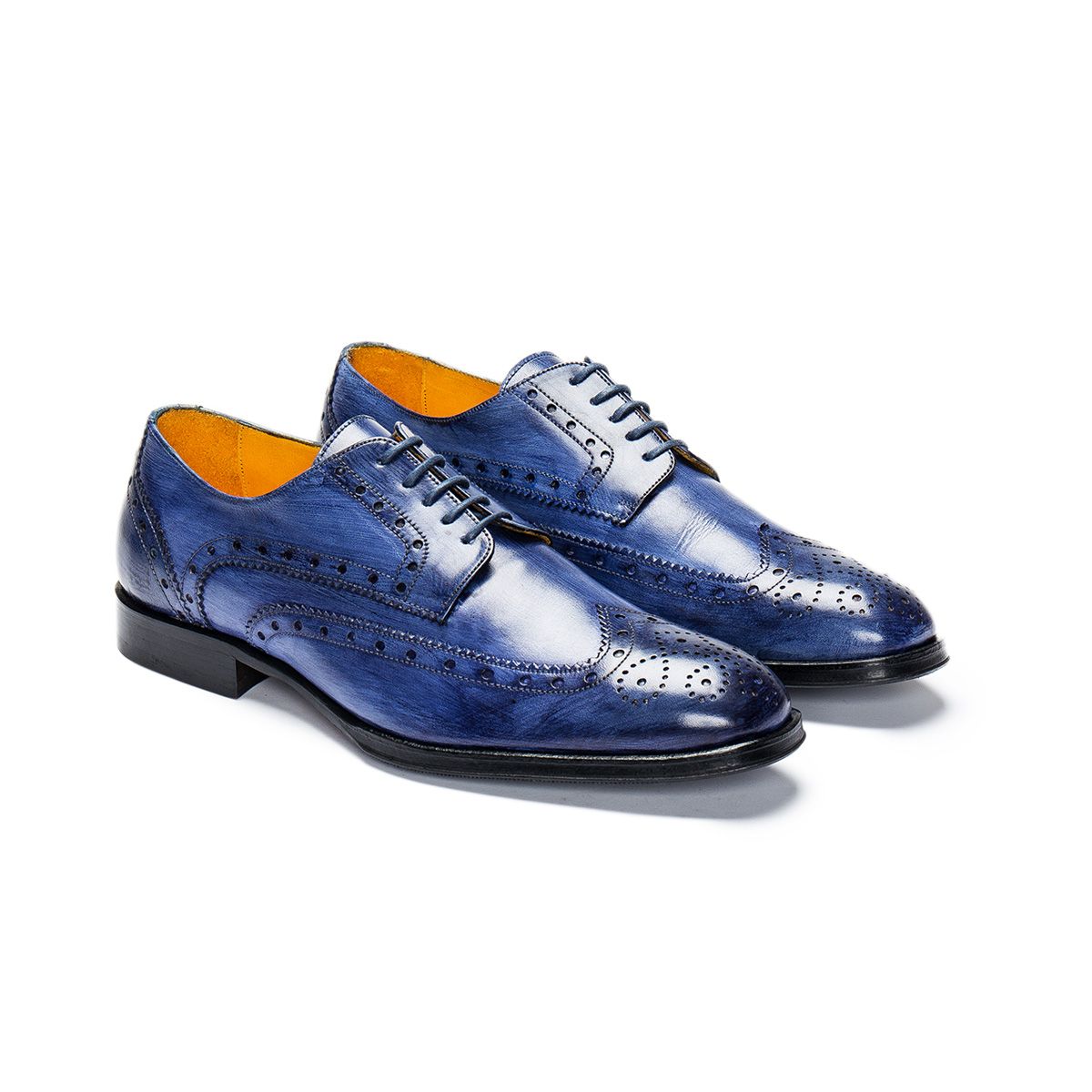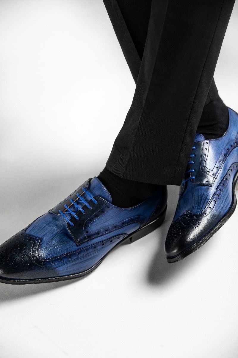 Rounded Full Brogue Wing Tip Blue Oxford Genuine Leather Lace Up Handmade Black Sole Shoes