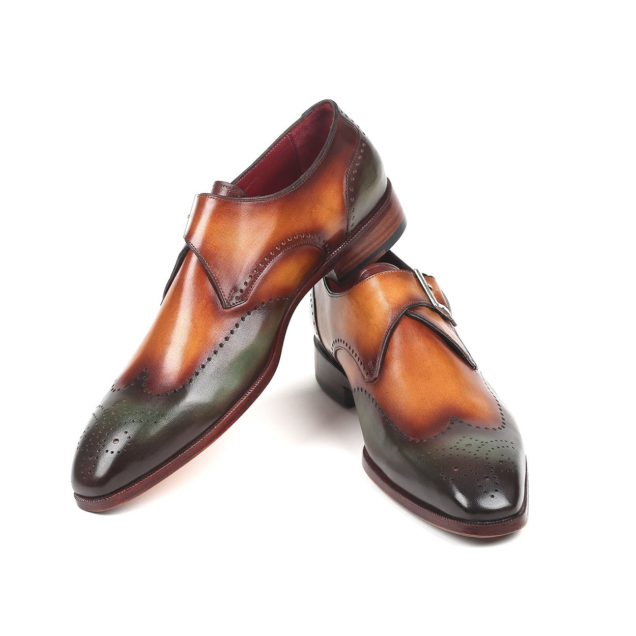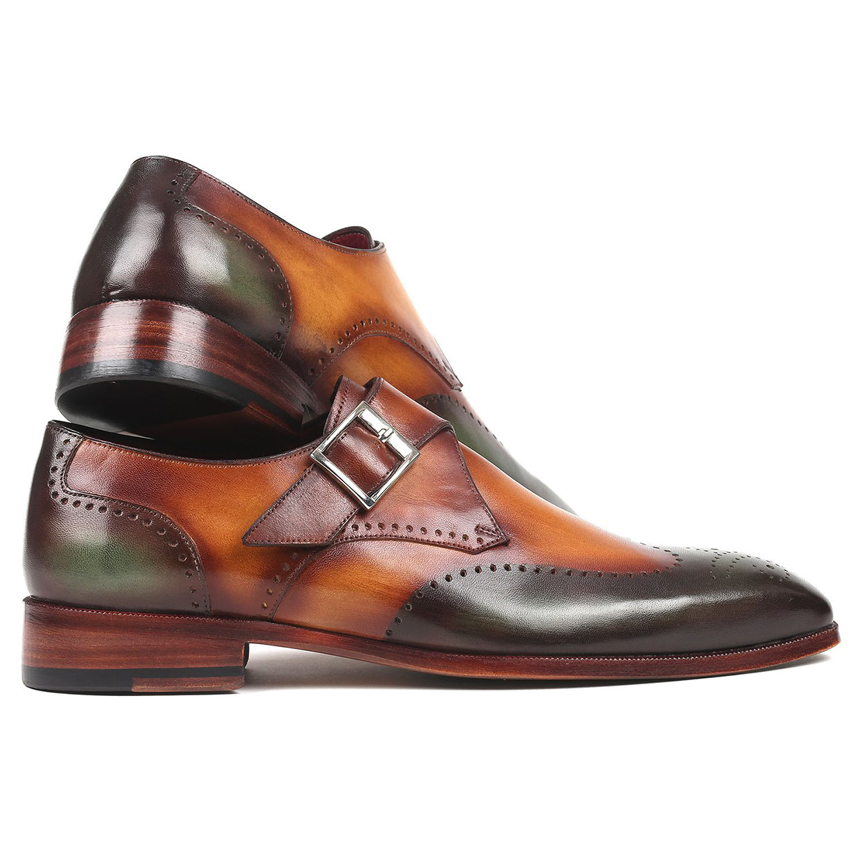 Single Buckle Monk Strap Green Brown Wing Tip Vintage Leather Brogue Toe Handmade Matching Sole Shoes