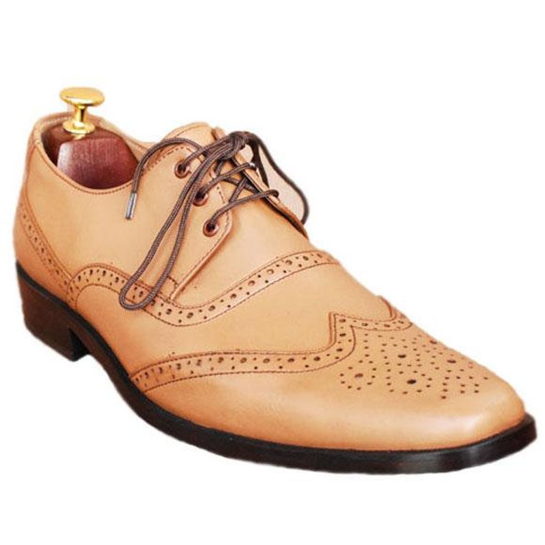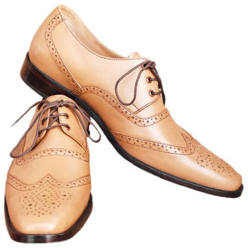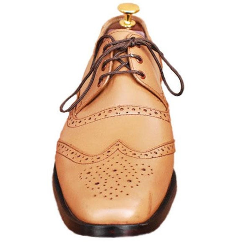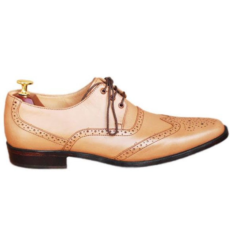 Oxford Wing Tip Genuine Leather Tan Color Brogue Toe Handmade Lace Up Matching Sole Shoes
