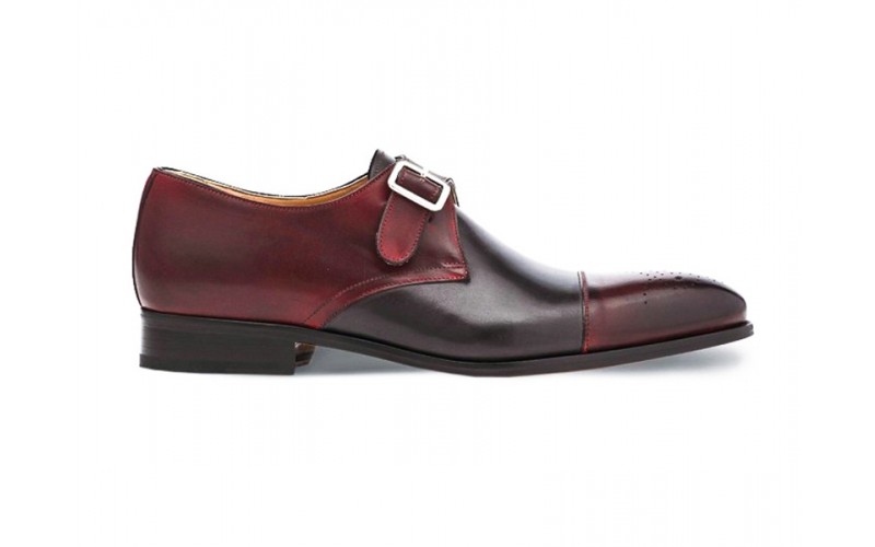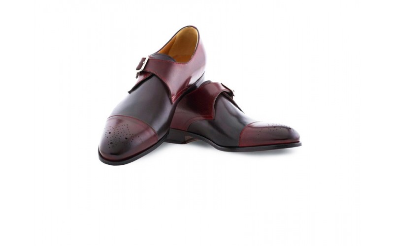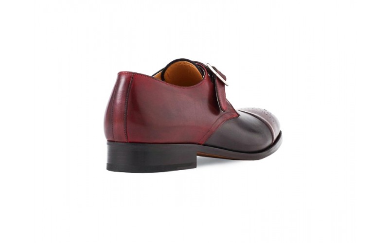 Two Tone Monk Burgundy Single Buckle Strap Burnished Brogue Cap Toe Genuine Leather Shoes