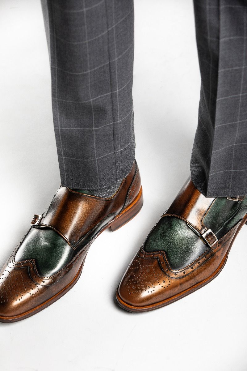 Double Buckle Monk Strap Green Brown Wing Tip Full Brogue Toe Vintage Leather Handmade Shoes