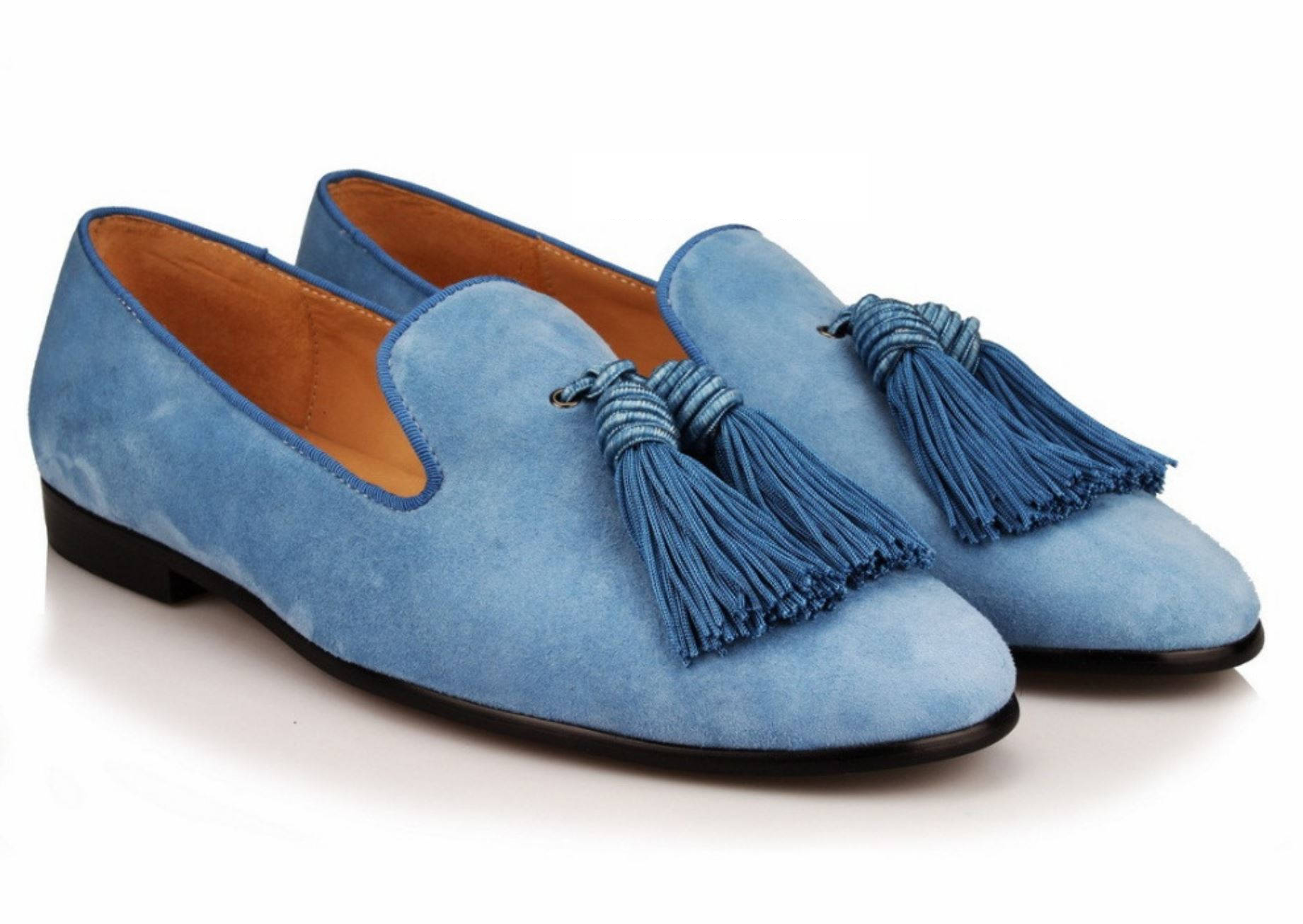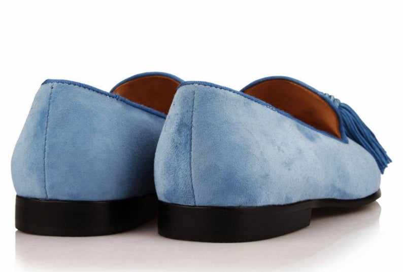 Blue Tassel Loafer Slip On Suede Real Leather Black Sole Handmade Footwear Shoes