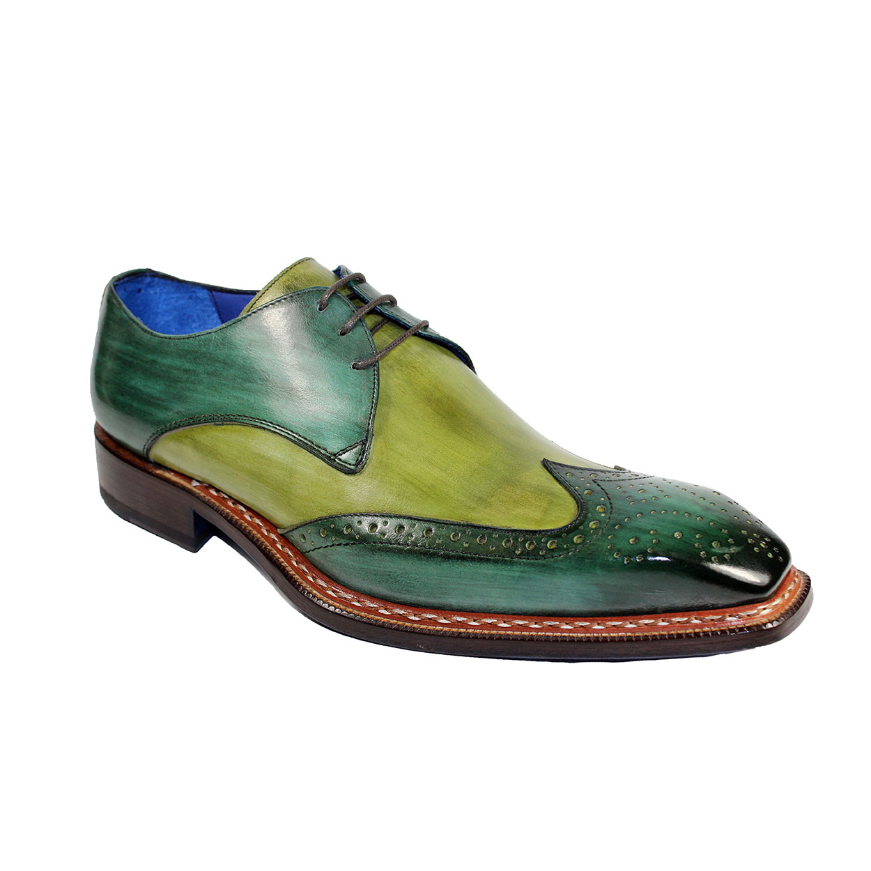 Wing Tip Two Tone Green Burnished Brogue Toe Vintage Leather Patina Hand Painted Lace Up Shoes
