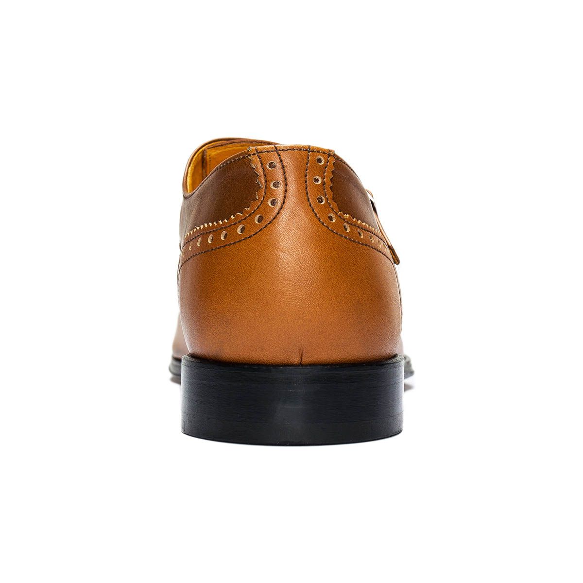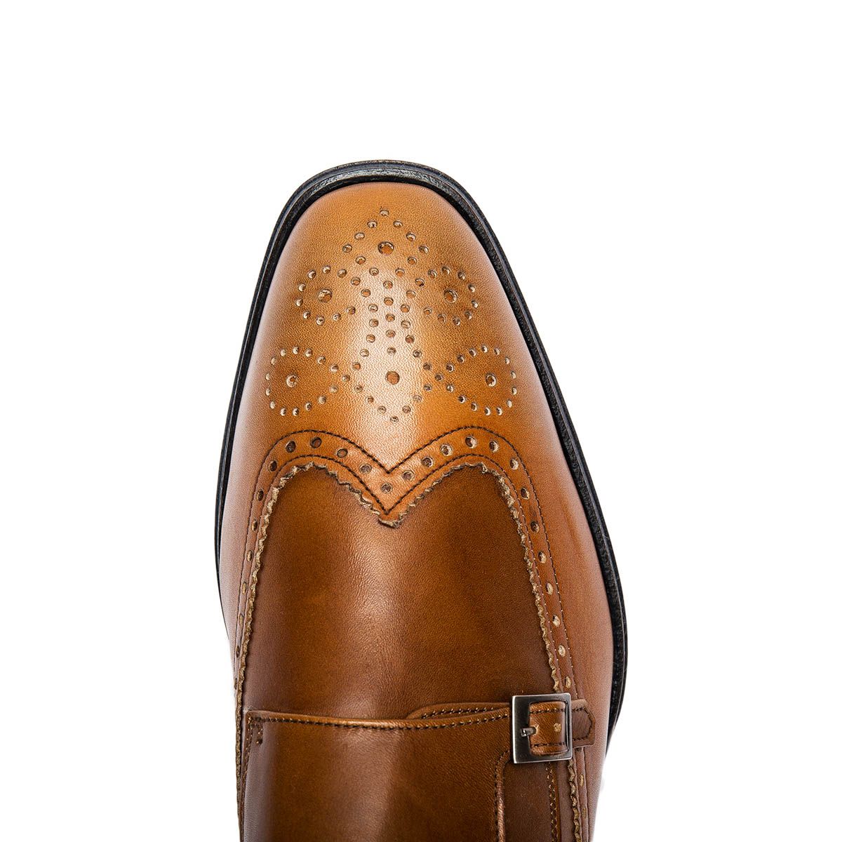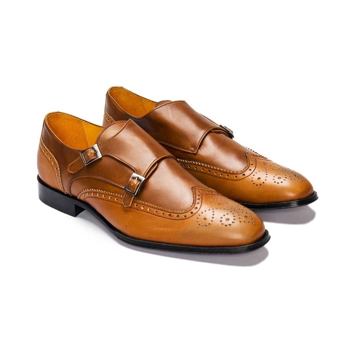 Tan Color Monks Double Buckle Strap Wing Tip Medallion Toe Genuine Leather Handmade Shoes