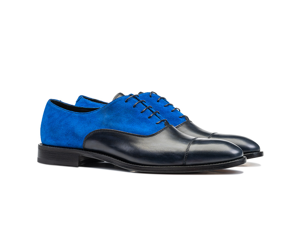 Oxford Blue Suede Black Genuine Leather Derby Cap Toe Handmade Lace Up Formal Shoes