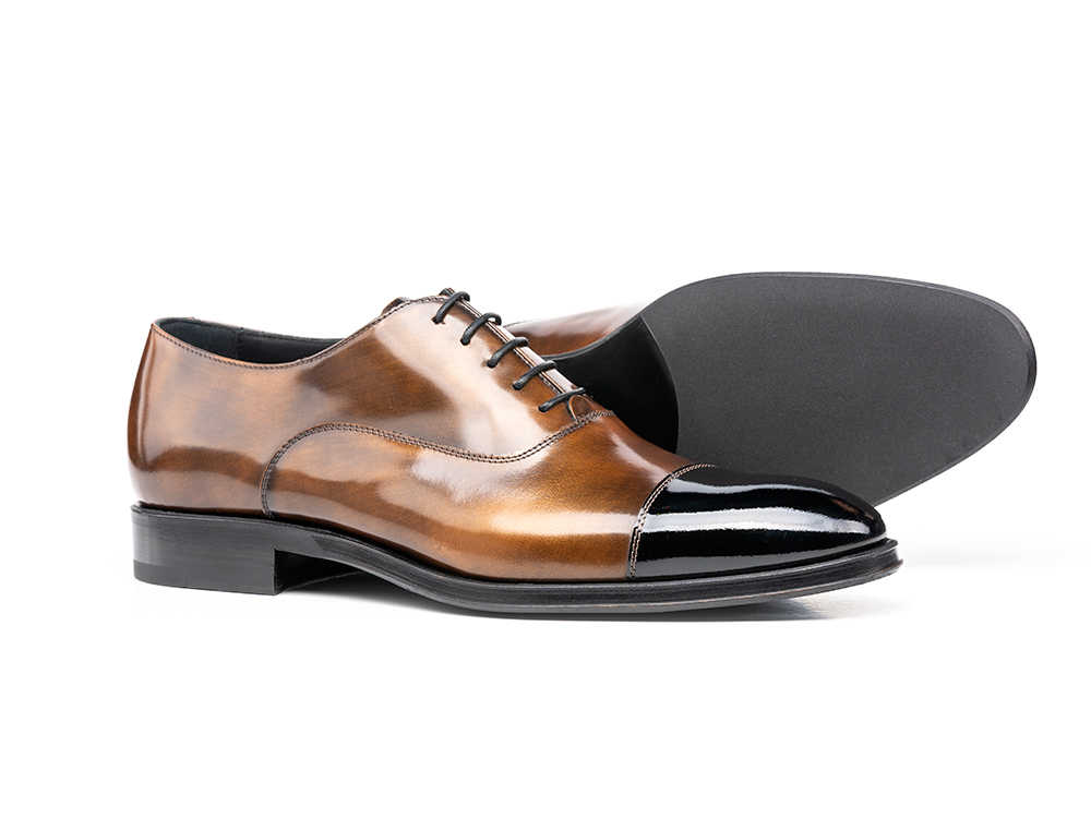 Shiny Brown Black Oxford Patent Genuine Leather Derby Cap Toe Handmade Formal Shoes