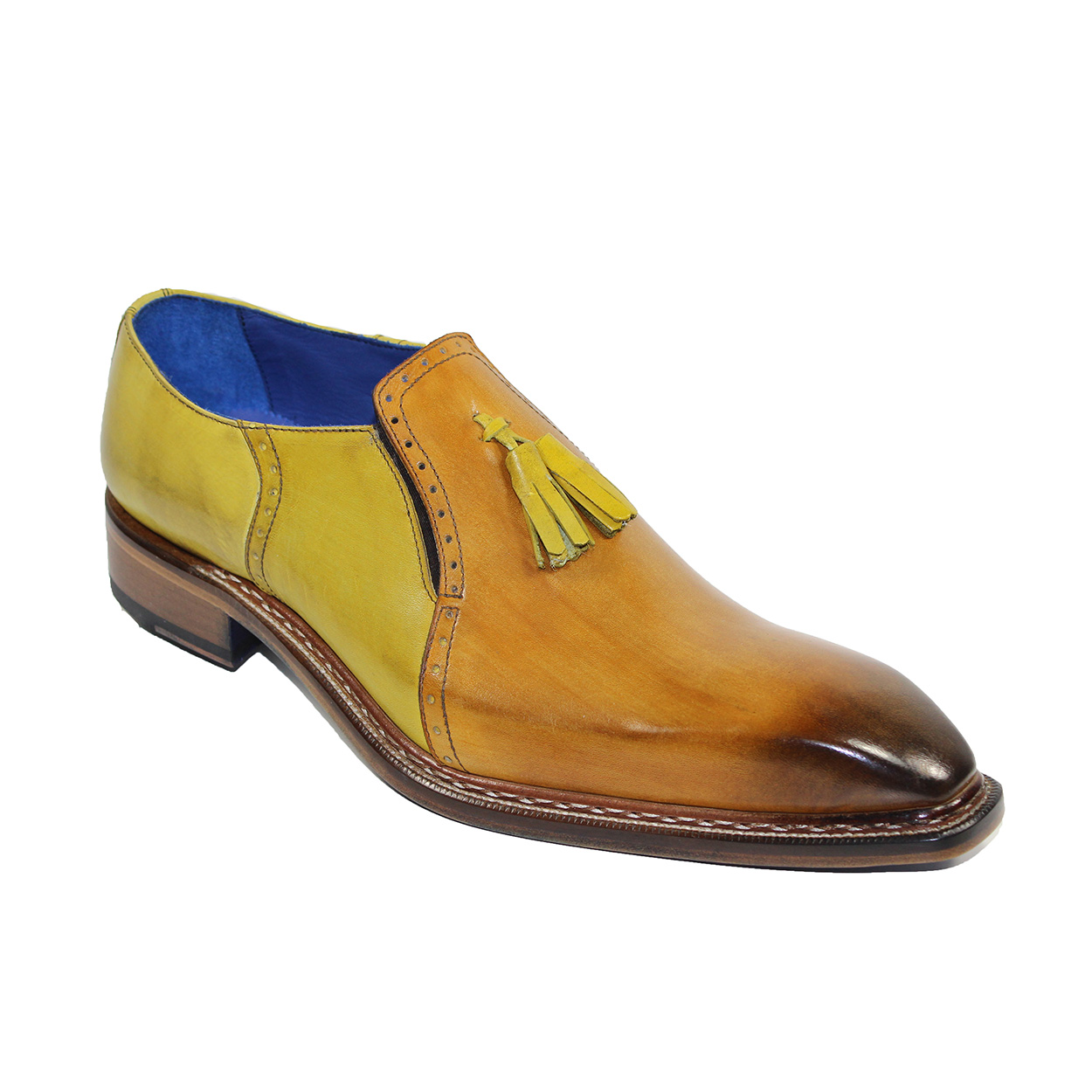 Two Tone Tassel Loafer Slip On Tan Yellow Real Leather Burnished Derby Toe Patina Hand Painted Shoes