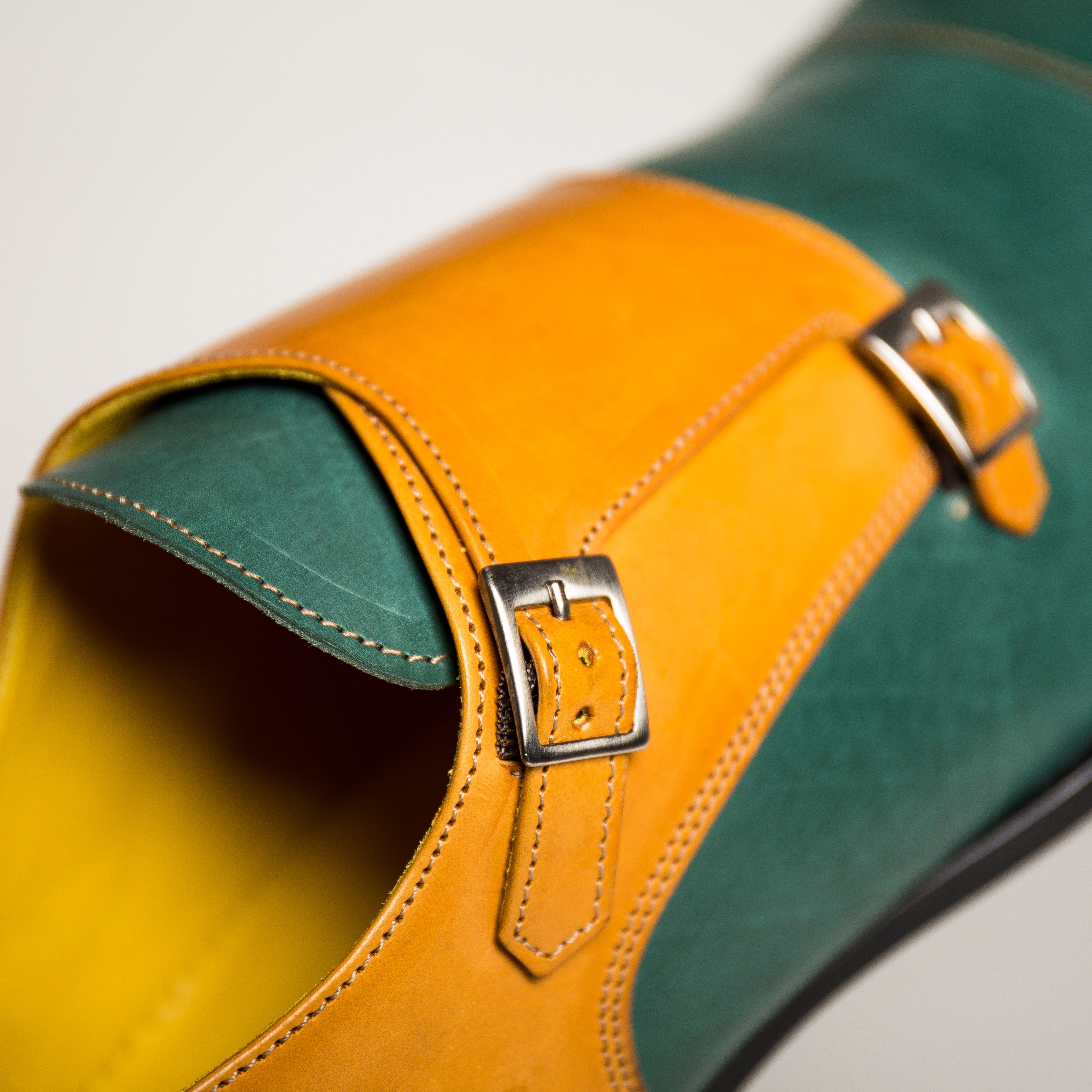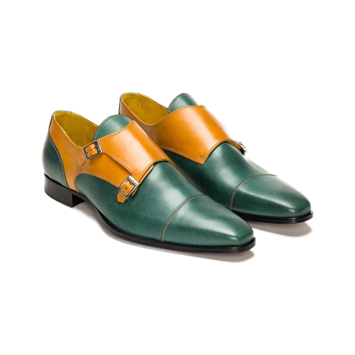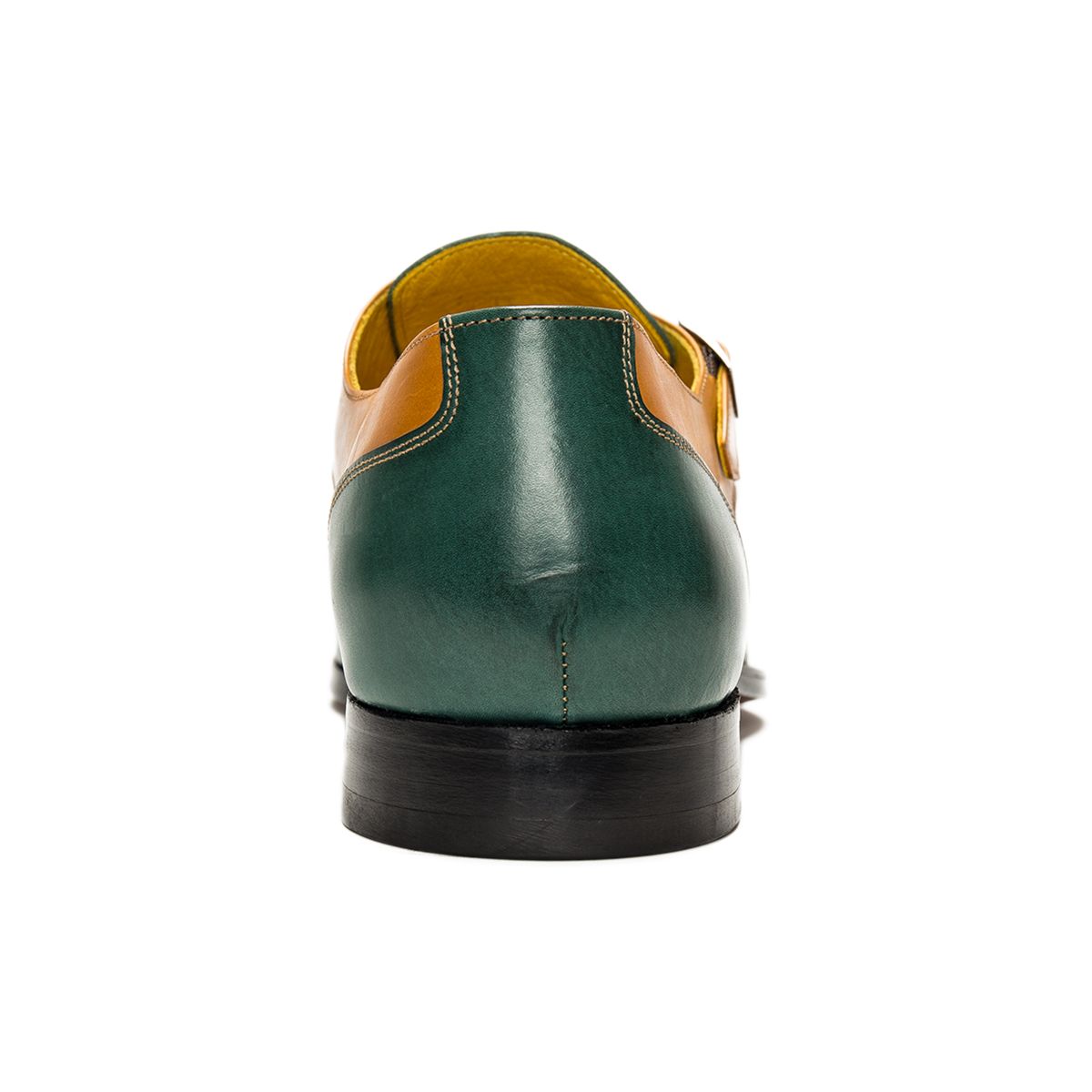 Monk Genuine Leather Tan Green Double Buckle Strap Derby Cap Toe Handmade Shoes