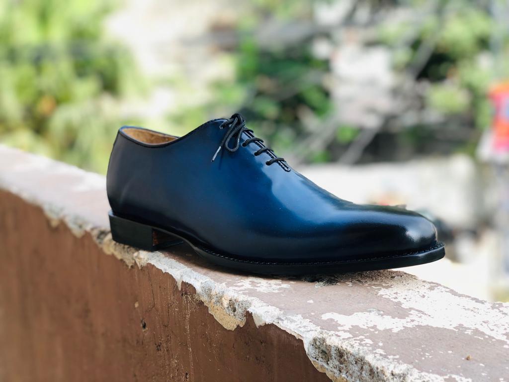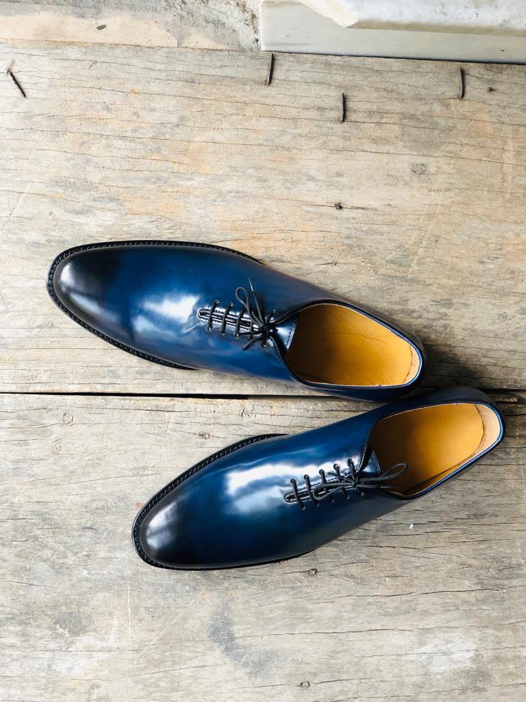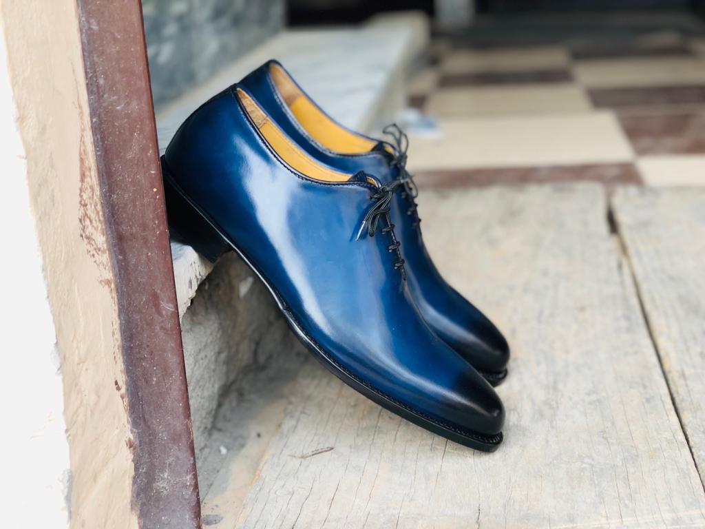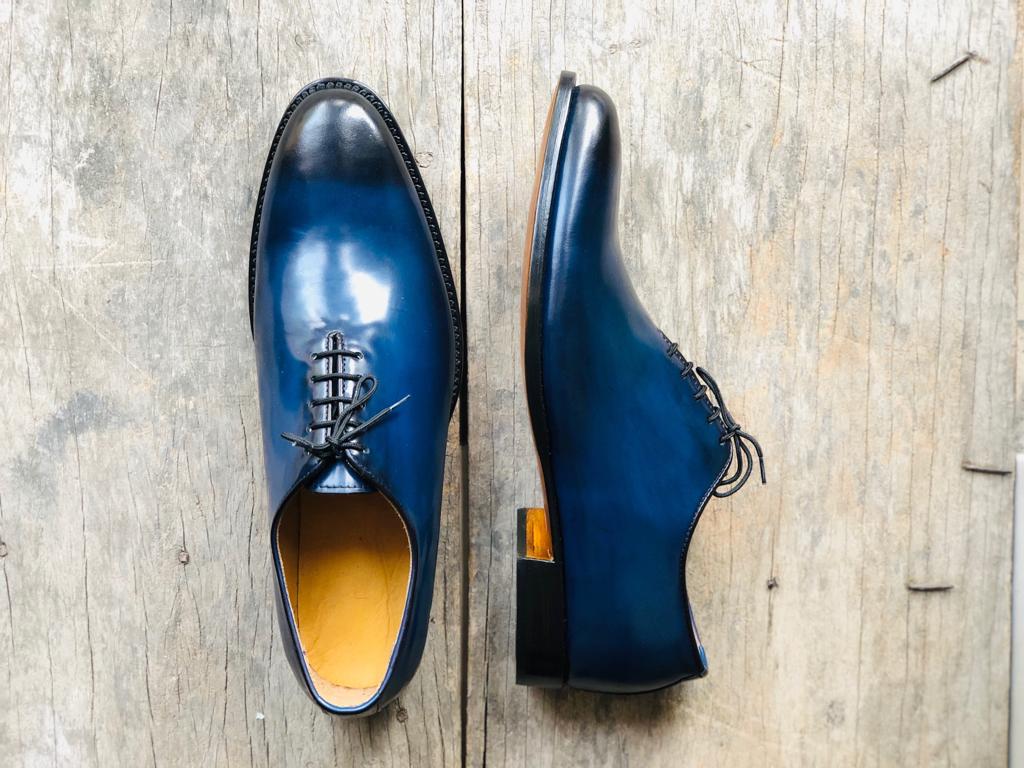 Formal Oxford Blue Burnished Genuine Leather Rounded Derby Toe Handmade Lace Up Men Shoes