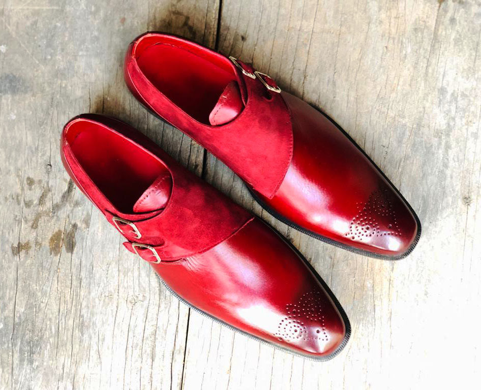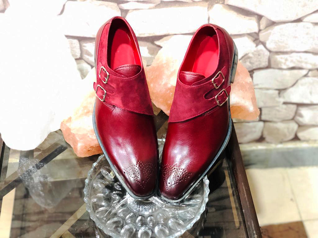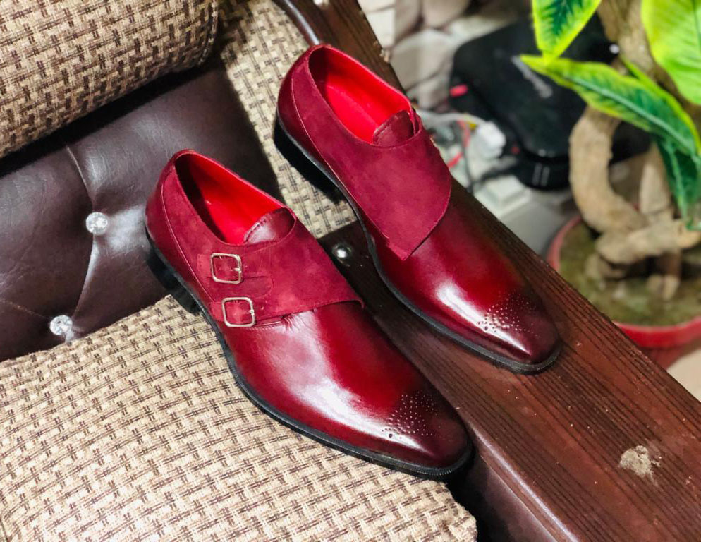Monk Maroon Double Buckle Strap Real Suede Leather Medallion Toe Handmade Shoes