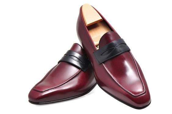 Penny Moccasin Loafer Slip on Maroon Black Cont Vintage Leather Rounded Derby Toe Handmade Shoes