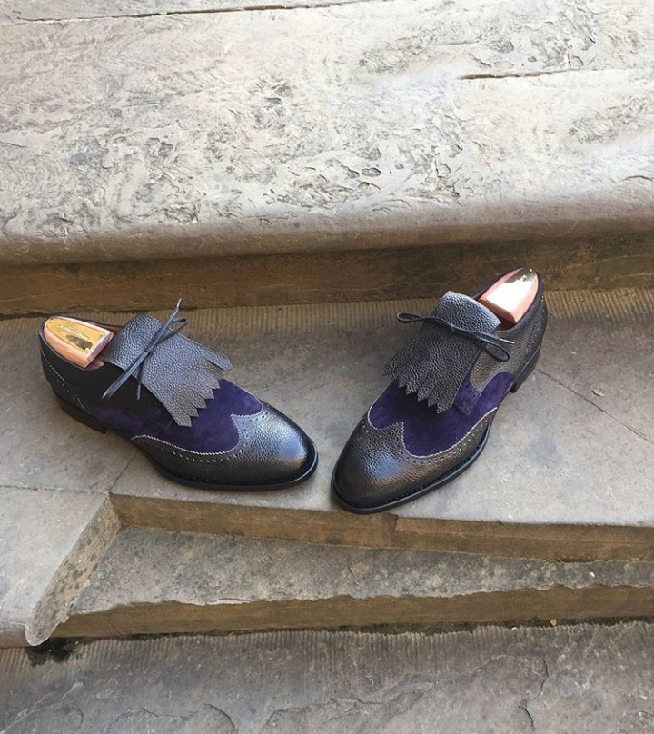 Blue Suede Wing Tip Gray Fringed Genuine Leather Derby Toe Handmade Men Shoes