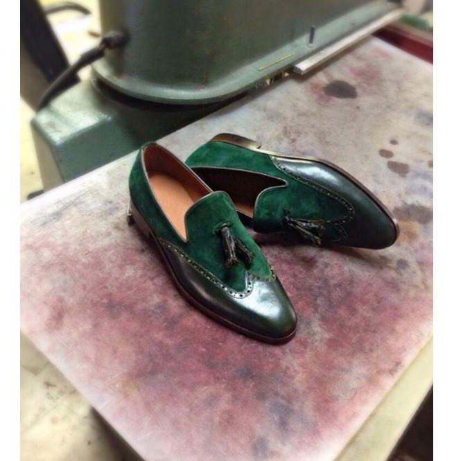Two Tone Suede Green Tassel Loafer Slip On Real Leather Wing Tip Derby Toe Handmade Shoes