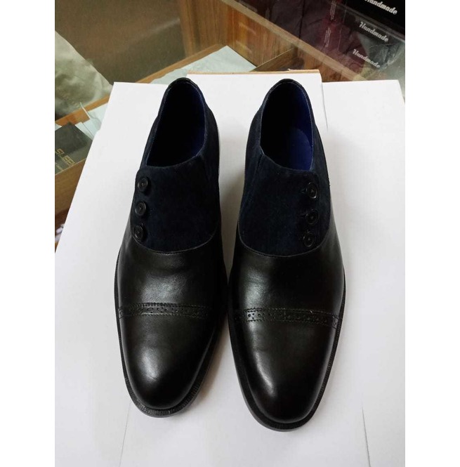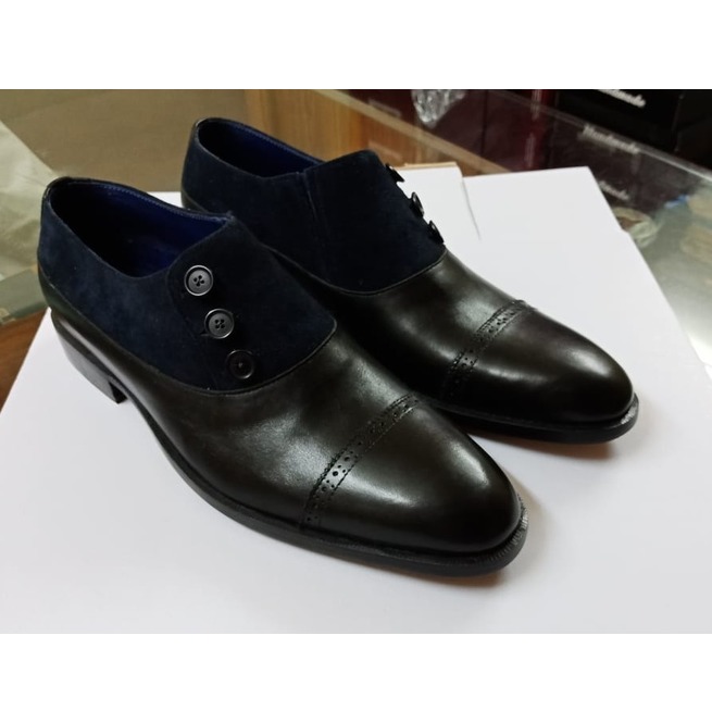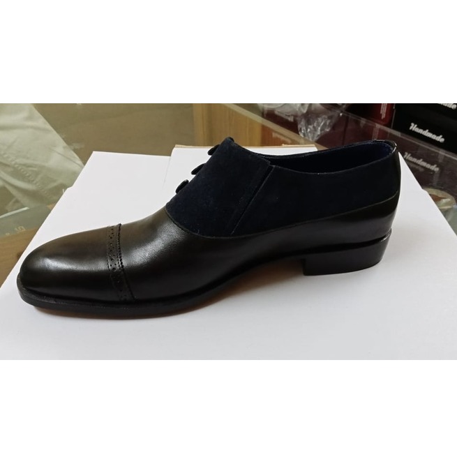Suede Blue Two Tone Black Genuine Leather Derby Cap Toe Handmade Button Boots