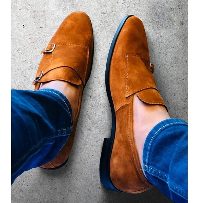 Brown Suede Double Buckle Monk Strap Real Leather Derby Toe Handmade Men Shoes