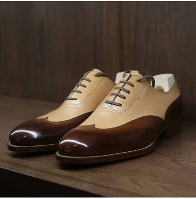 Tan Brown Two Tone Men Genuine Patent Leather Derby Toe Lace Up Handmade Wing Tip Shoes