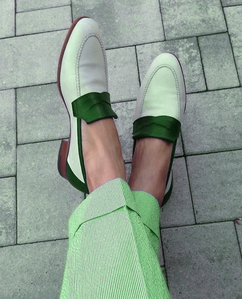 Penny Loafer Slip On Green White Cont Moccasin Genuine Leather Rounded Apron Toe Handmade Shoes