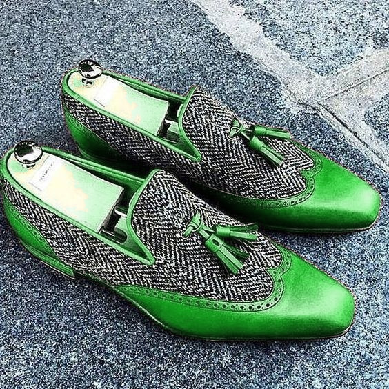Wing Tip Green Black Tassel Loafer Slip On Tweed Genuine Leather Derby Toe Handmade Shoes