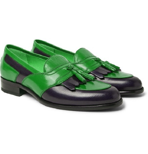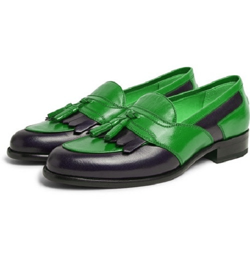 Green Black Tassel Loafer Slip On Genuine Leather Fringed Rounded Apron Toe Handmade Shoes