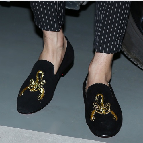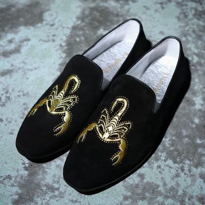 Black Velvet Loafer Slippers Gold Embroidery Scorpion Patch Genuine Handmade Party Fashion Shoes