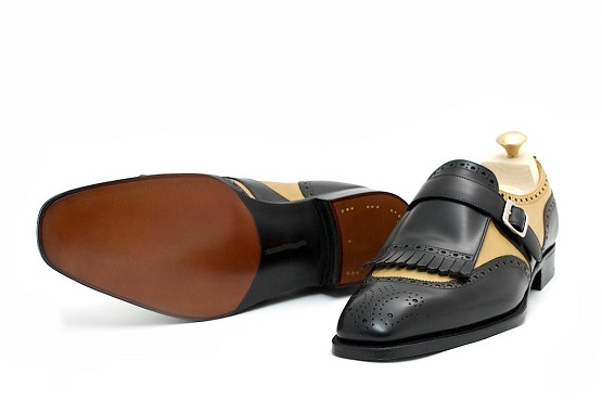 Monk Tan Black Cont Real Leather Fringed Single Buckle Strap Handmade Brogue Toe Shoes