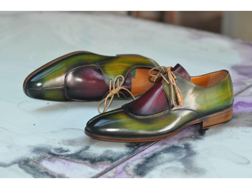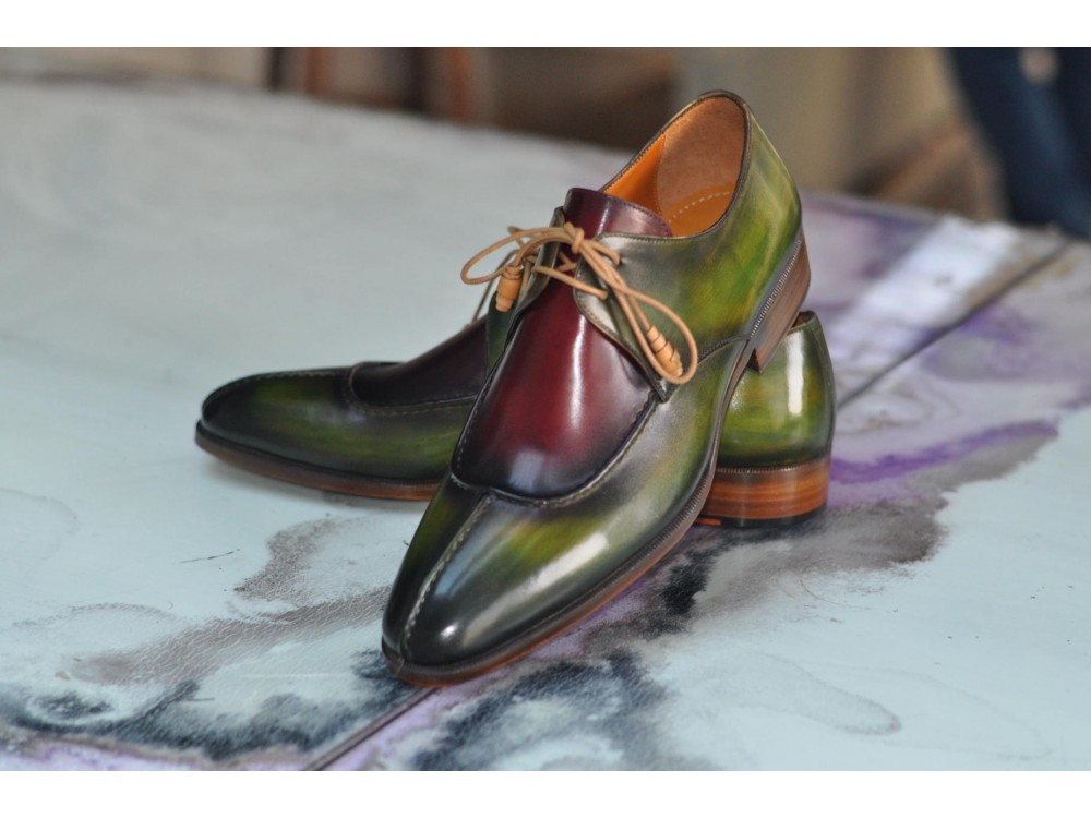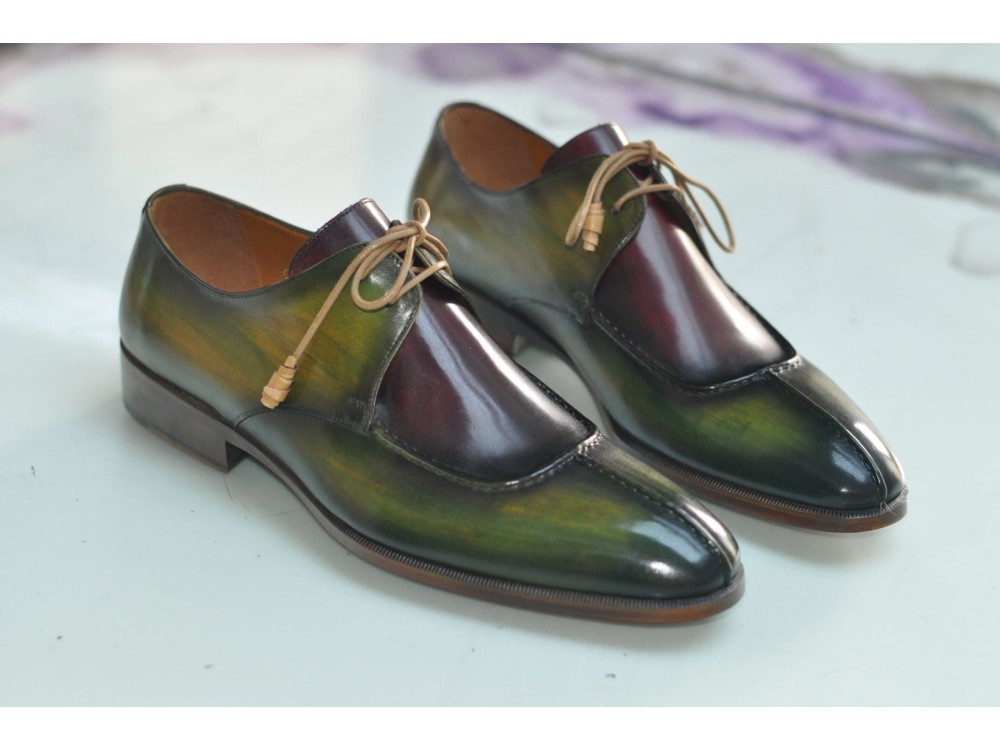 Patina Hand Painted Green Burgundy Vintage Leather Rounded Split Toe Lace Up Handmade Shoes