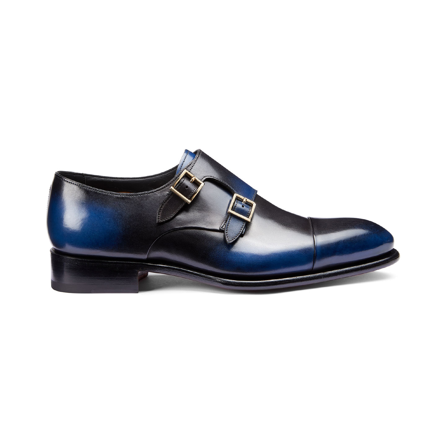 Monk Blue Patent Brown Real Leather Double Buckle Strap Rounded Derby Cap Toe Handmade Shoes
