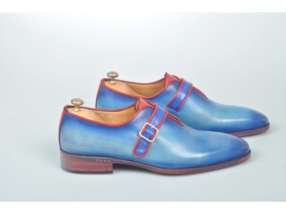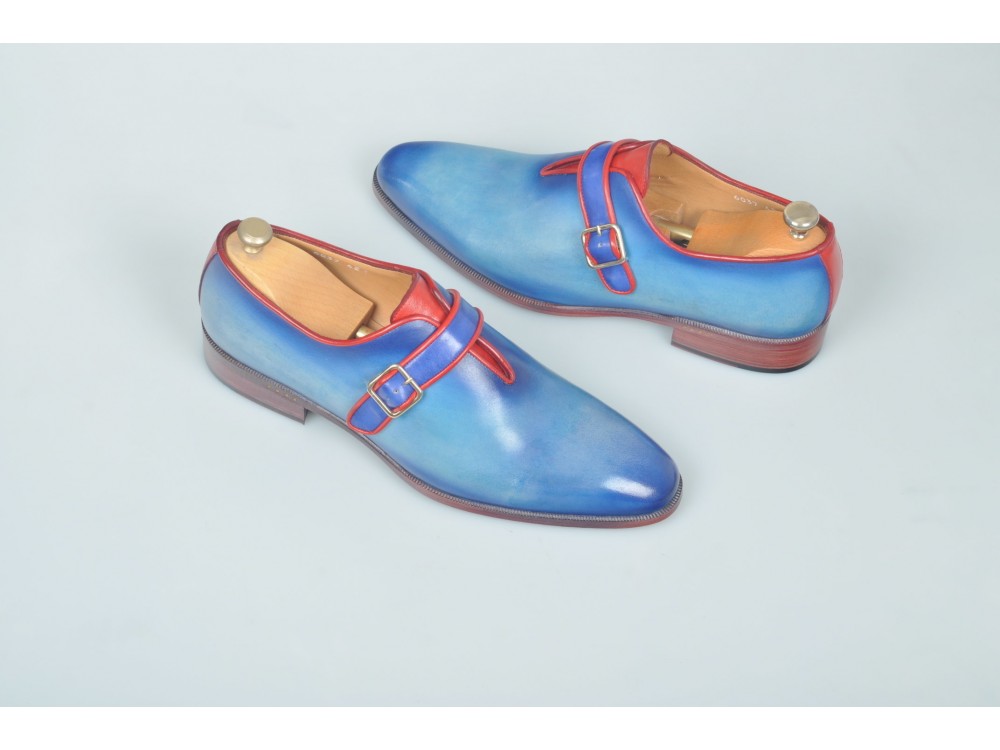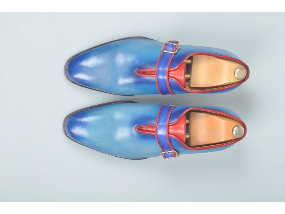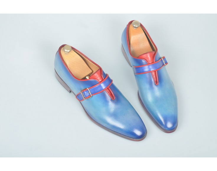 Patina Hand Painted Blue Red Cont Rounded Derby Single Buckle Monk Strap Vintage Leather Shoes