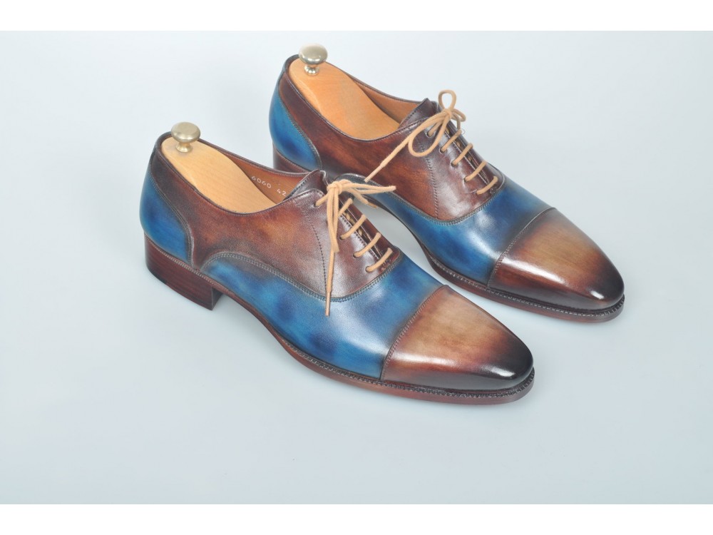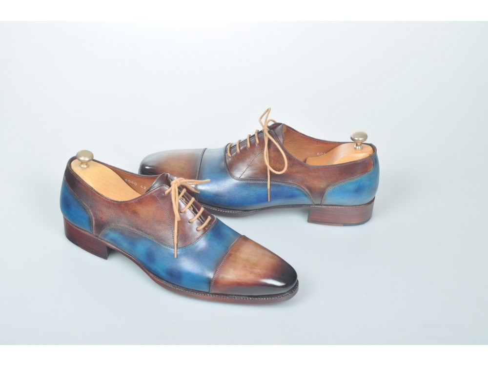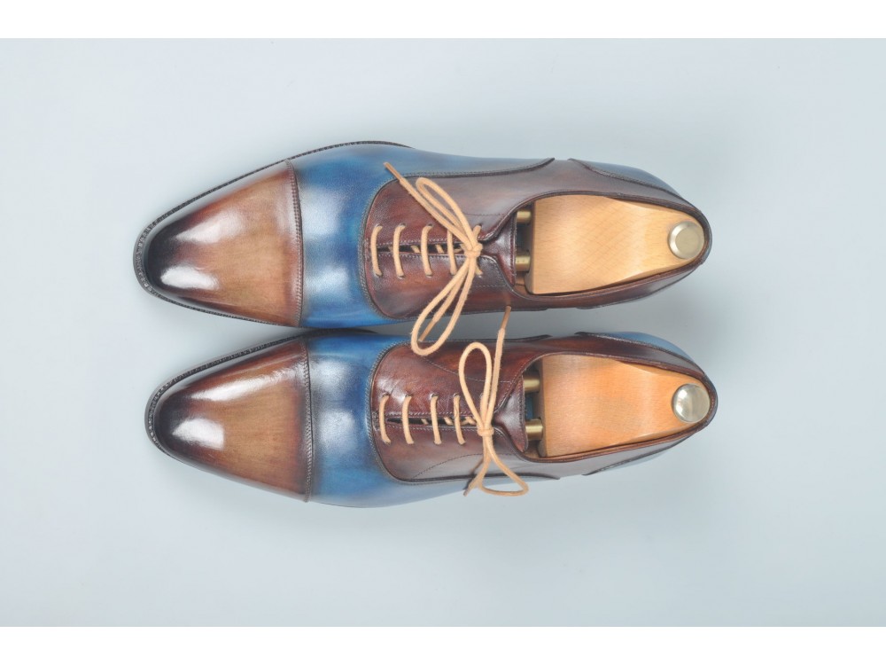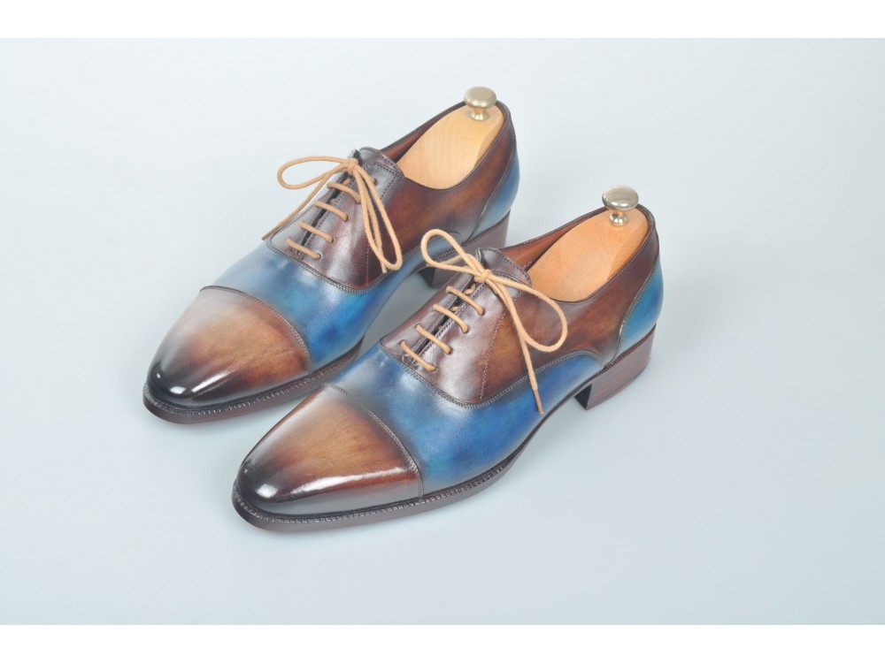 Patina Hand Painted Blue Brown Genuine Leather Burnished Derby Cap Toe Lace Up Tan Sole Shoes