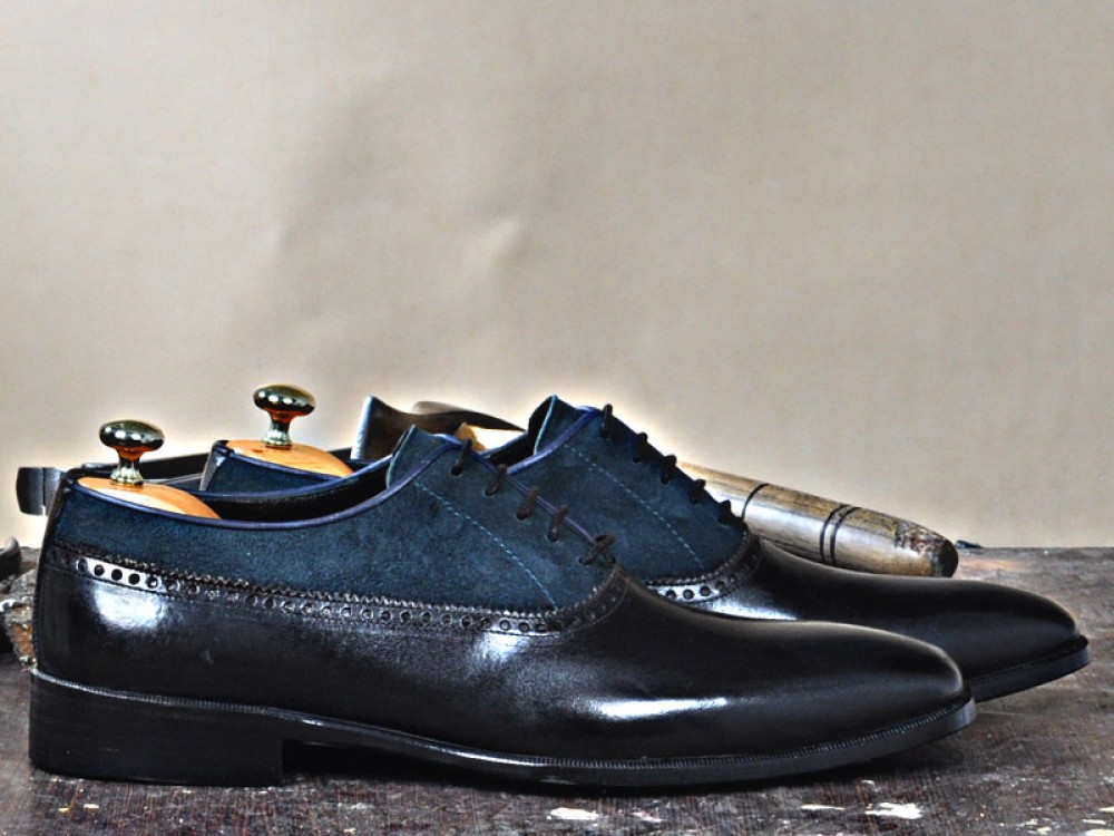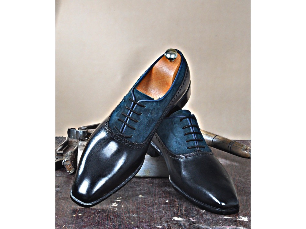 Customize Oxford Two Tone Blue Suede Real Leather Rounded Derby Toe Lace Up Handmade Shoes
