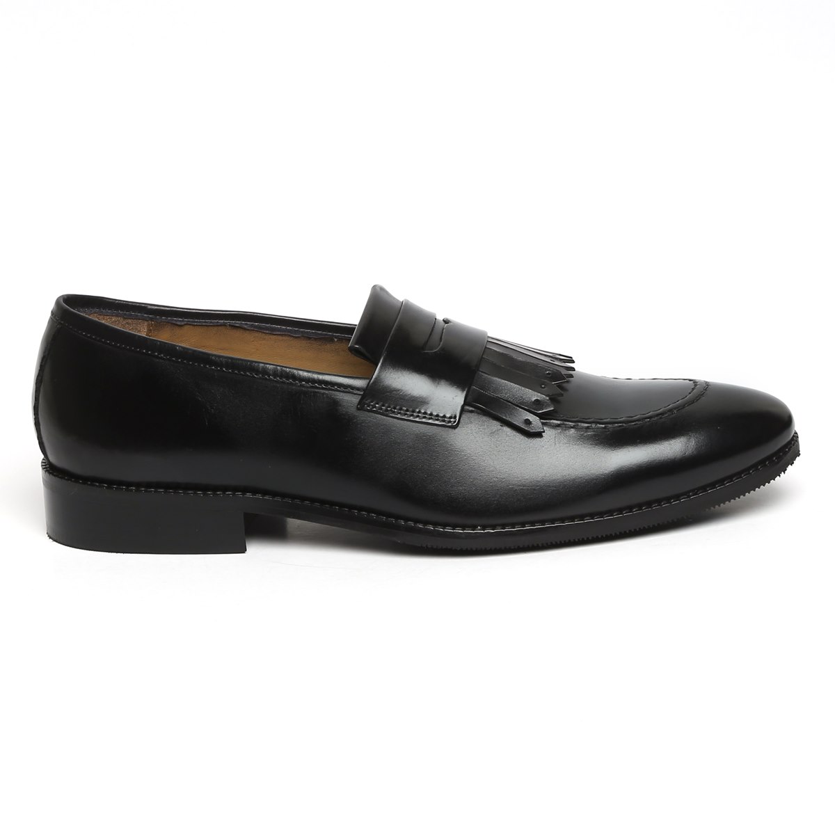 Black Fringed Moccasin Loafer Slip On Vintage Leather Rounded Apron Toe Handmade Shoes