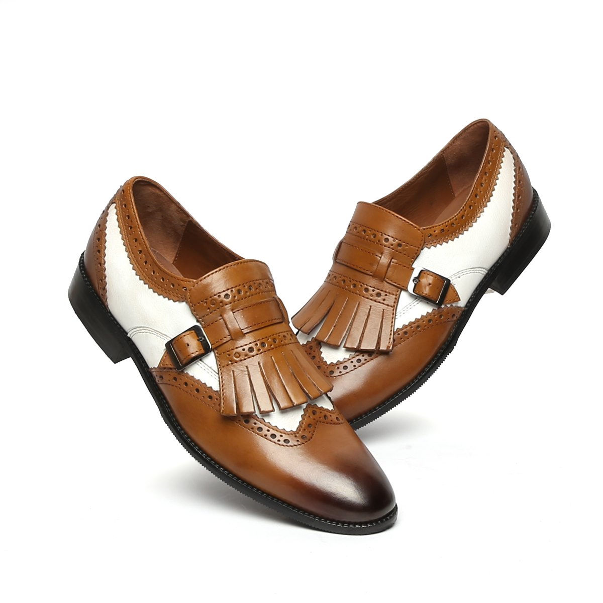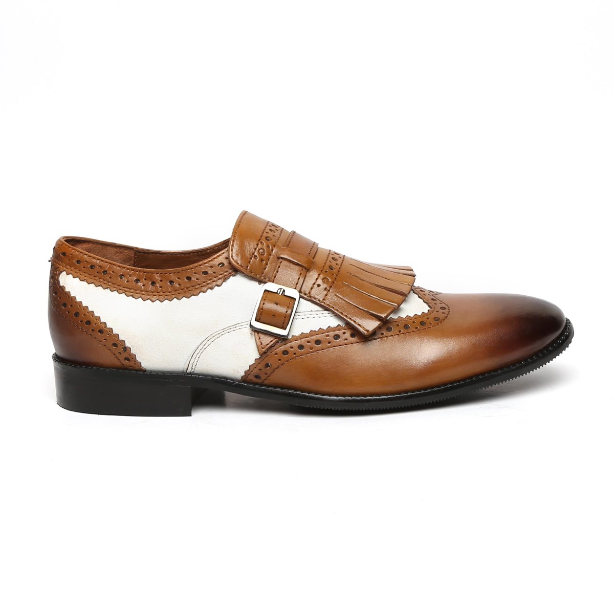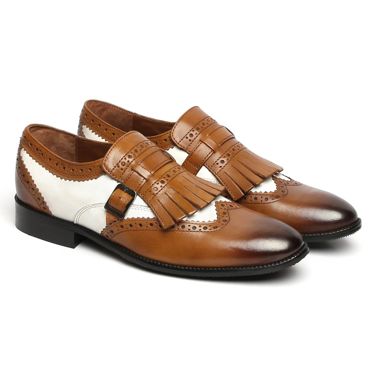Brown White Cont Single Buckle Monk Strap Fringed Real Leather Wing Tip Burnished Derby Shoes