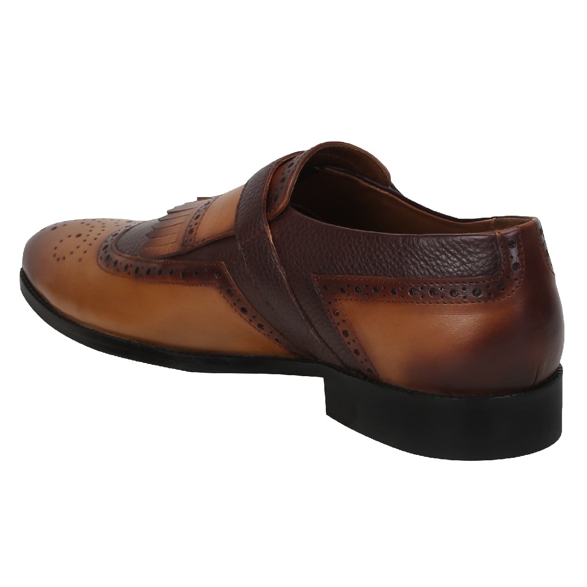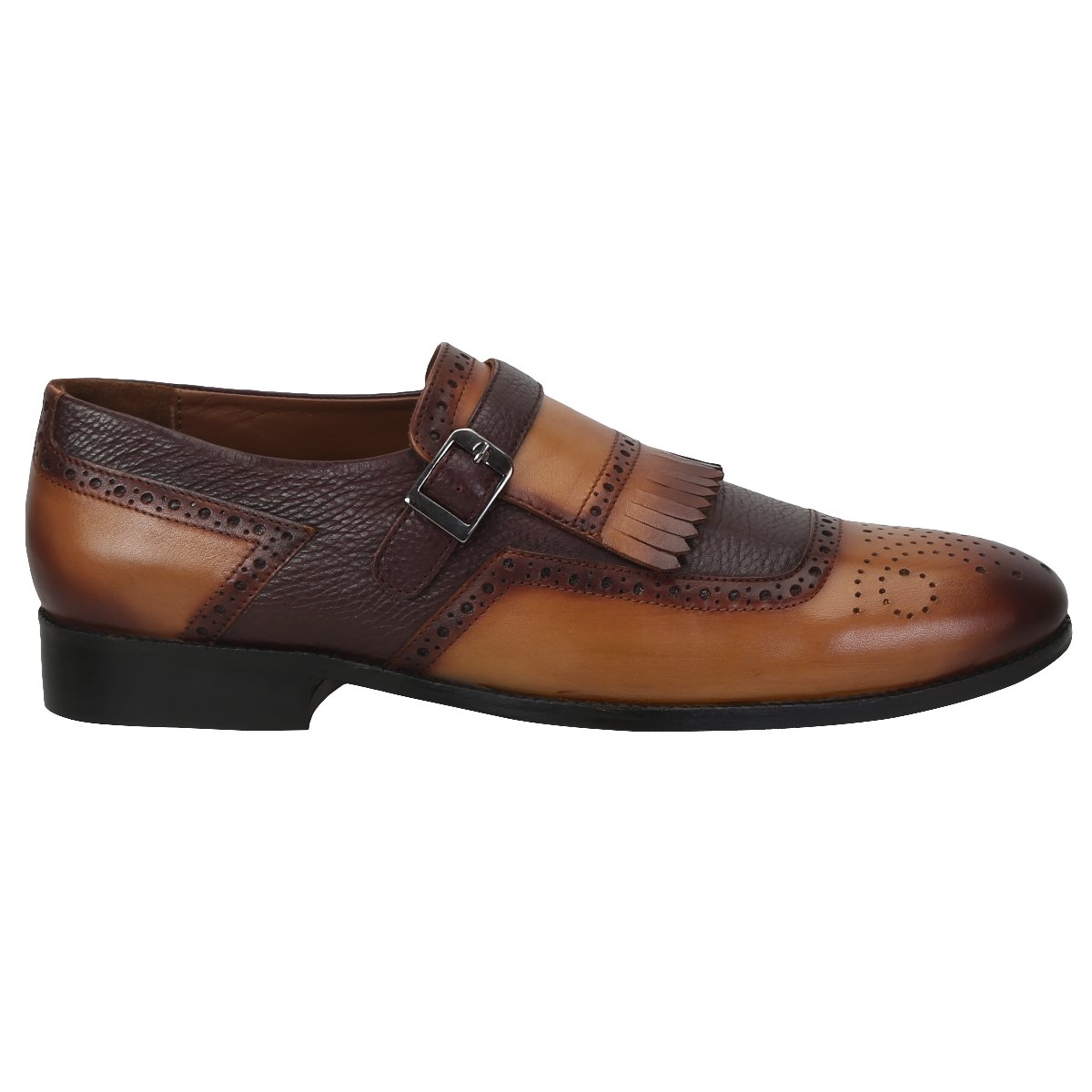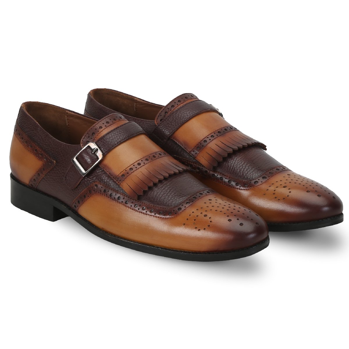 Monk Two Tone Brown Single Buckle Strap Fringed Real Leather Burnished Brogue Toe Handmade Shoes