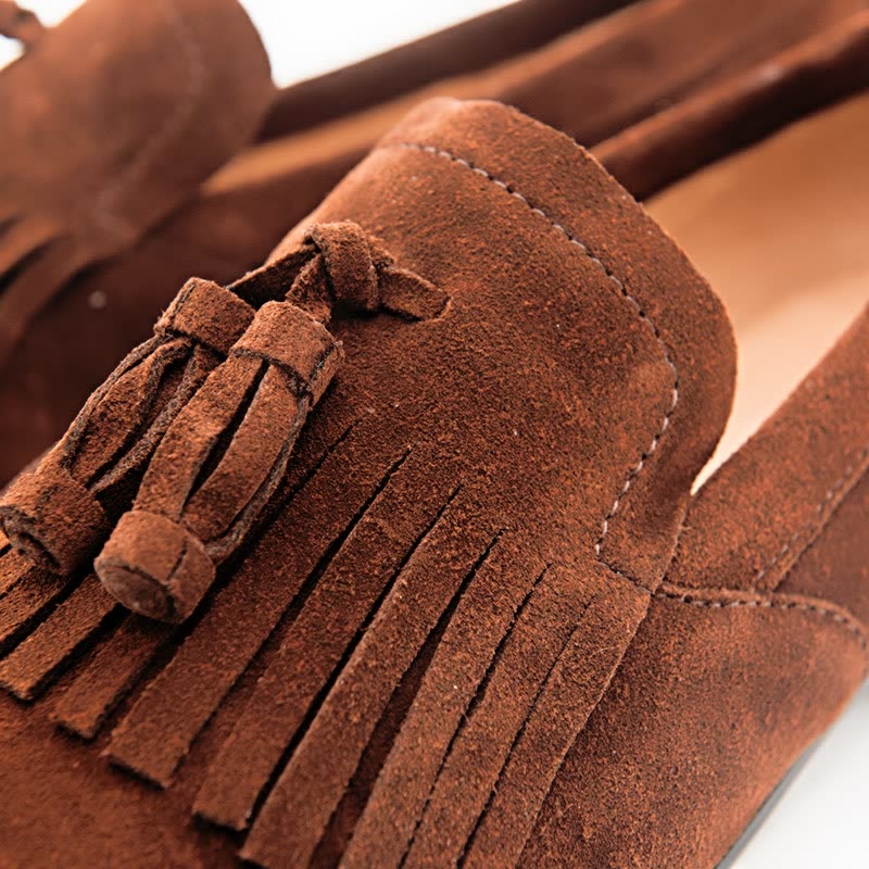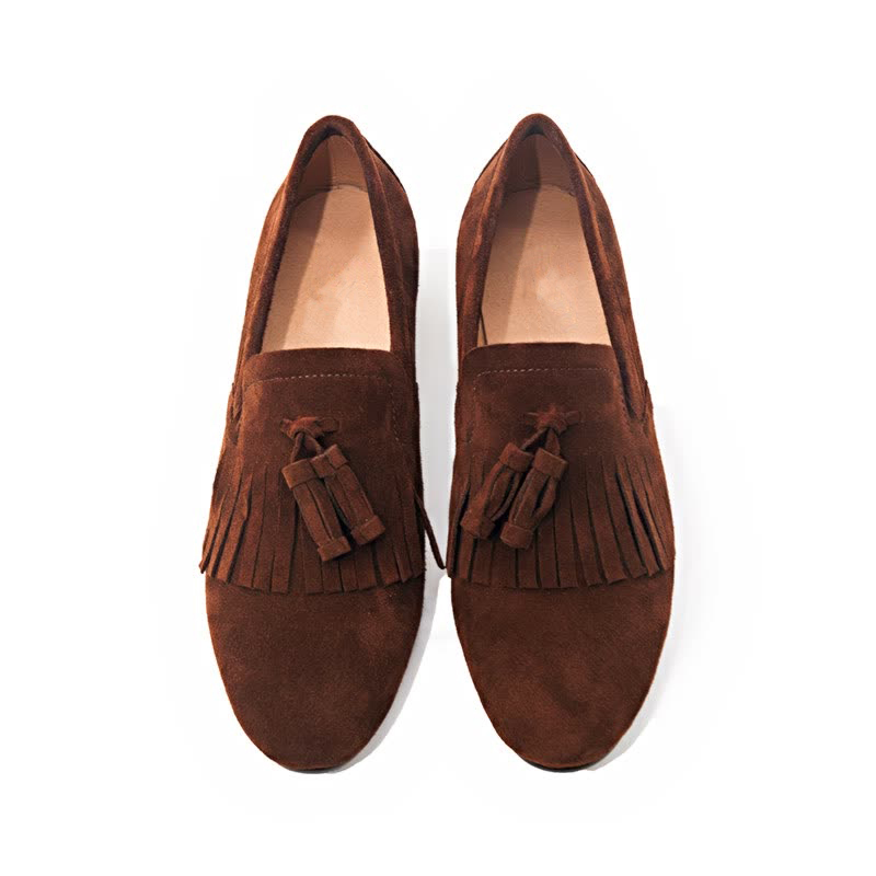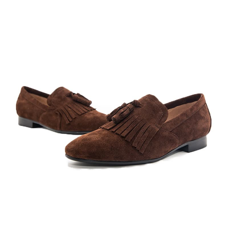 Brown Fringed Tassel Loafer Slip on Real Suede Leather Rounded Derby Toe Handmade Shoes