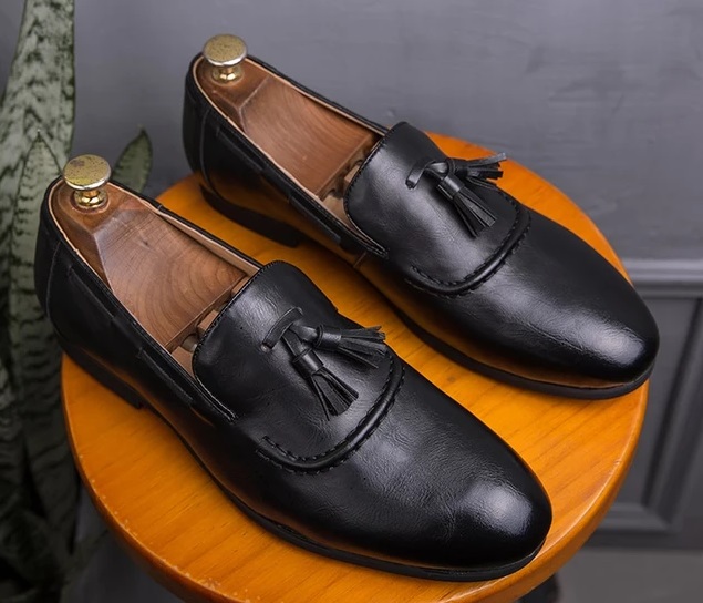 Tassel Loafer Slip On Black Genuine Leather Rounded Derby Toe Handmade Fashion Shoes
