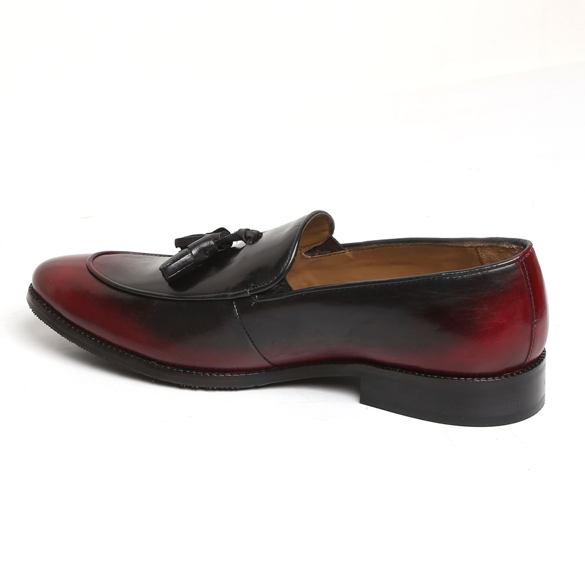 Two Tone Maroon Black Loafer Slip On Rounded Apron Toe Genuine Leather Handmade Tassel Shoes