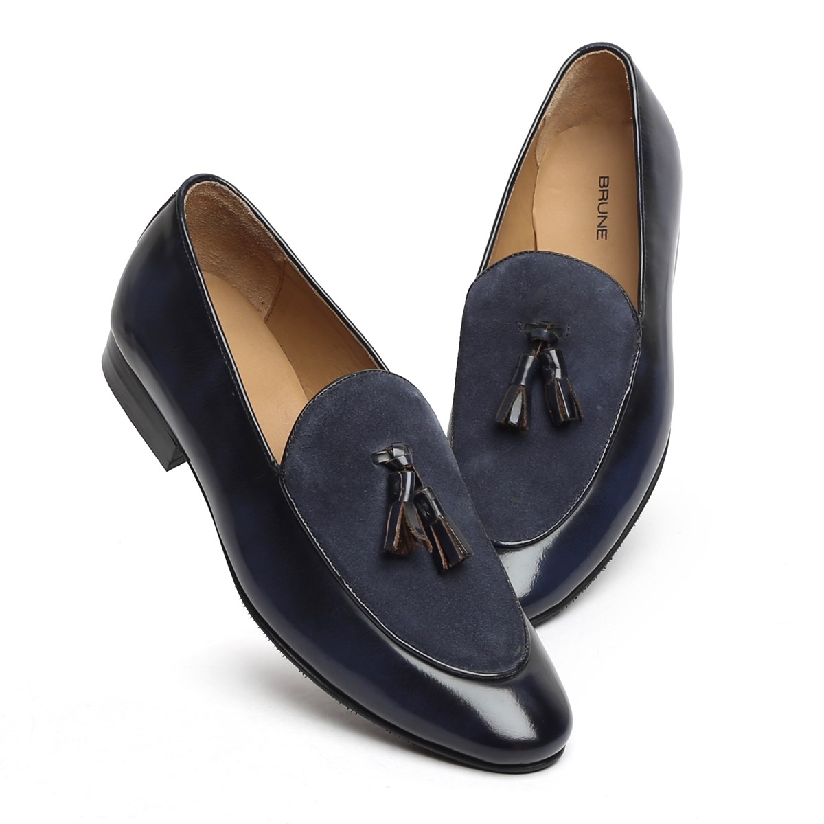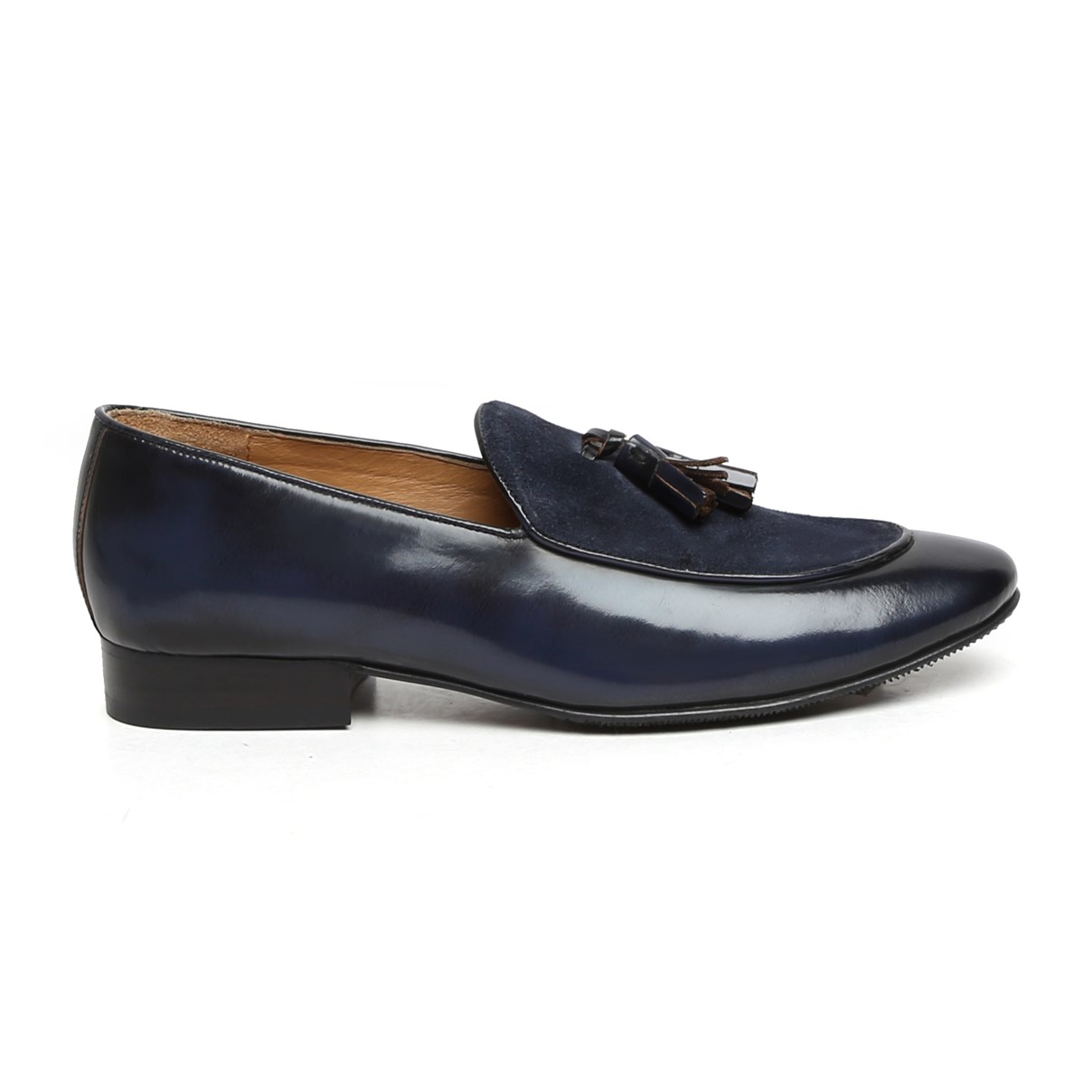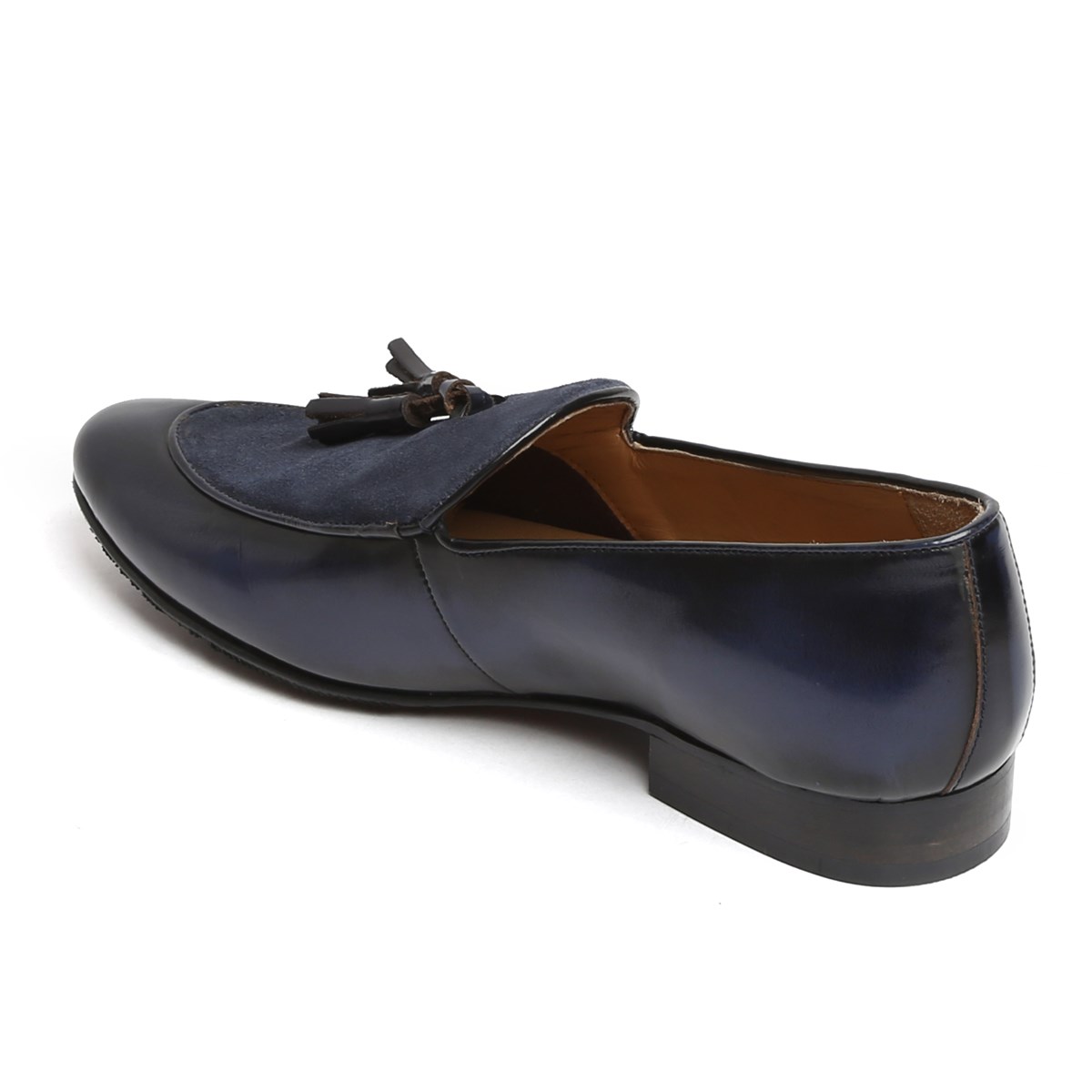 Navy Blue Tassel Loafer Slip On Suede Genuine Leather Rounded Apron Toe Handmade Men Shoes