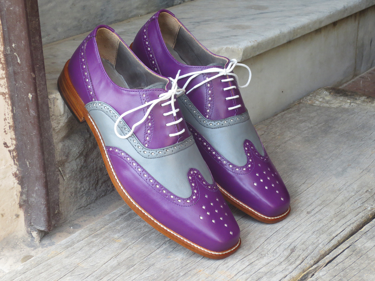 Wing Tip Two Tone Gray and Purple Vintage Leather Full Brogue Handmade Men Shoes