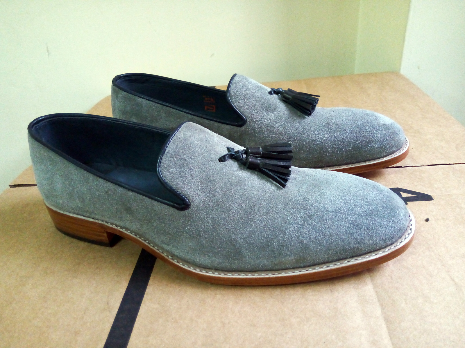 Gray Suede Loafer Slip On Black Tassel Genuine Leather Handmade Tan Sole Fashion Shoes