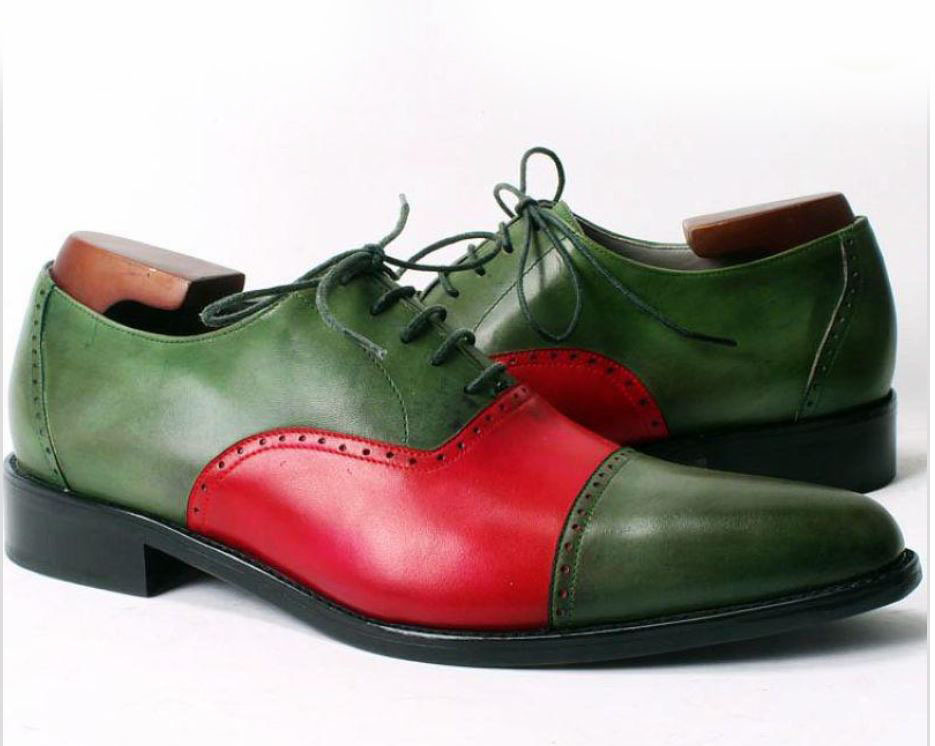 Two Tone Oxford Red Green Contrast Vintage Leather Rounded Derby Cap Toe Handcrafted Shoes