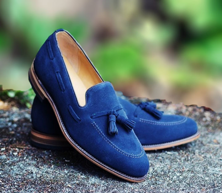 Royal Blue Suede Tassel Loafer Slip On Genuine Leather Rounded Apron Toe Handmade Shoes