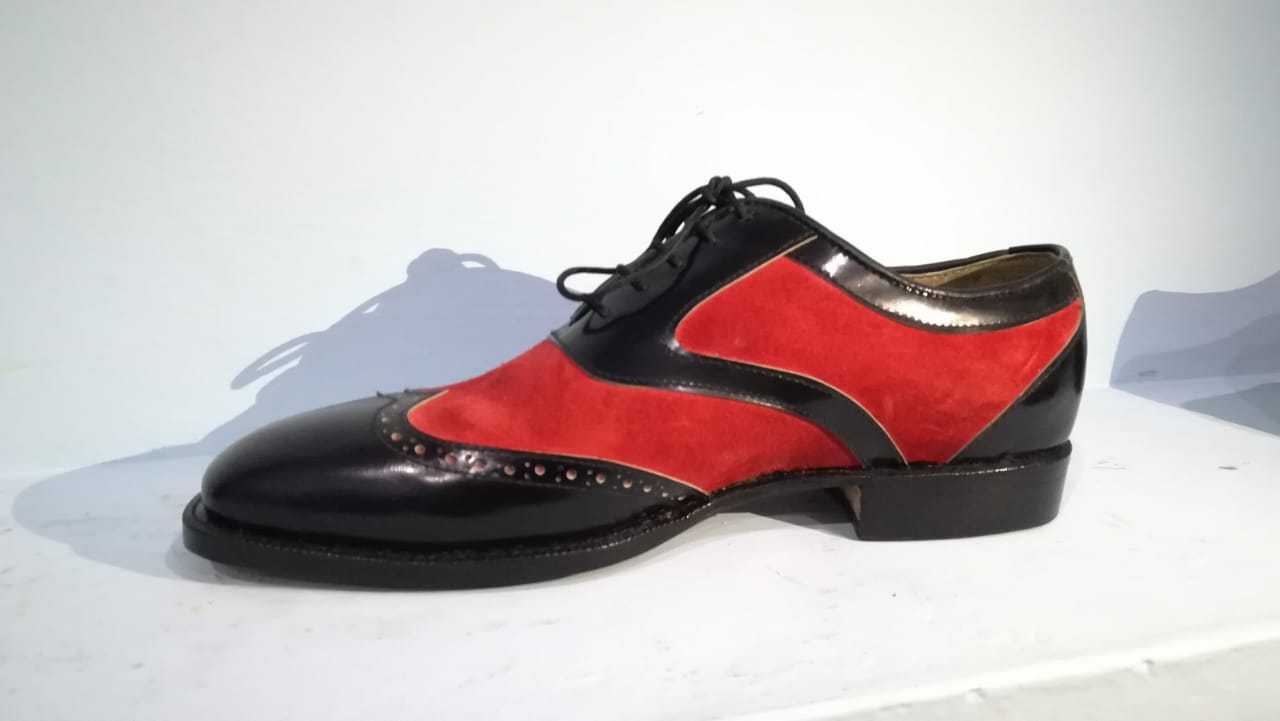 Wing Tip Red Suede Black Genuine Leather Lace Up Handmade Derby Toe Men Shoes
